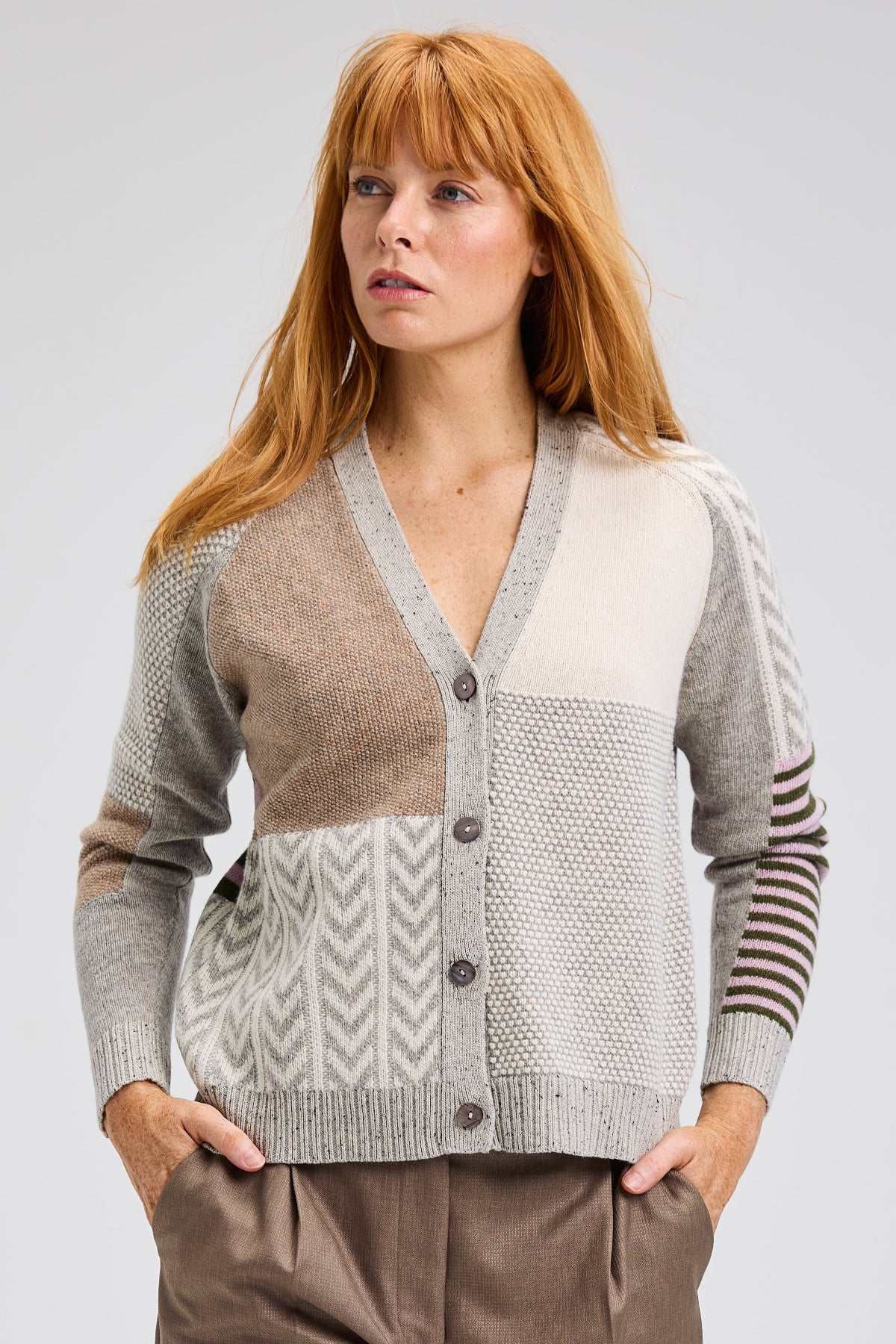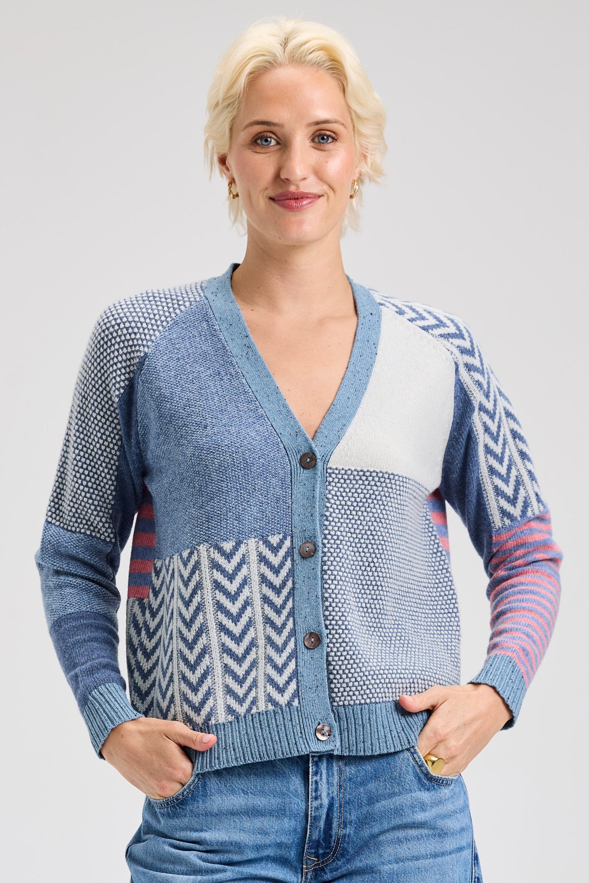 This Zaket & Plover cardigan features a 4-button V-neck design crafted from a wool blend that offers warmth and comfort. Its playful colour combination is enhanced by a variety of specialty knit stitches, creating rich texture and visual interest. Ideal for layering, this sweater combines expert craftsmanship with distinctive style, making it a versatile addition to any wardrobe.