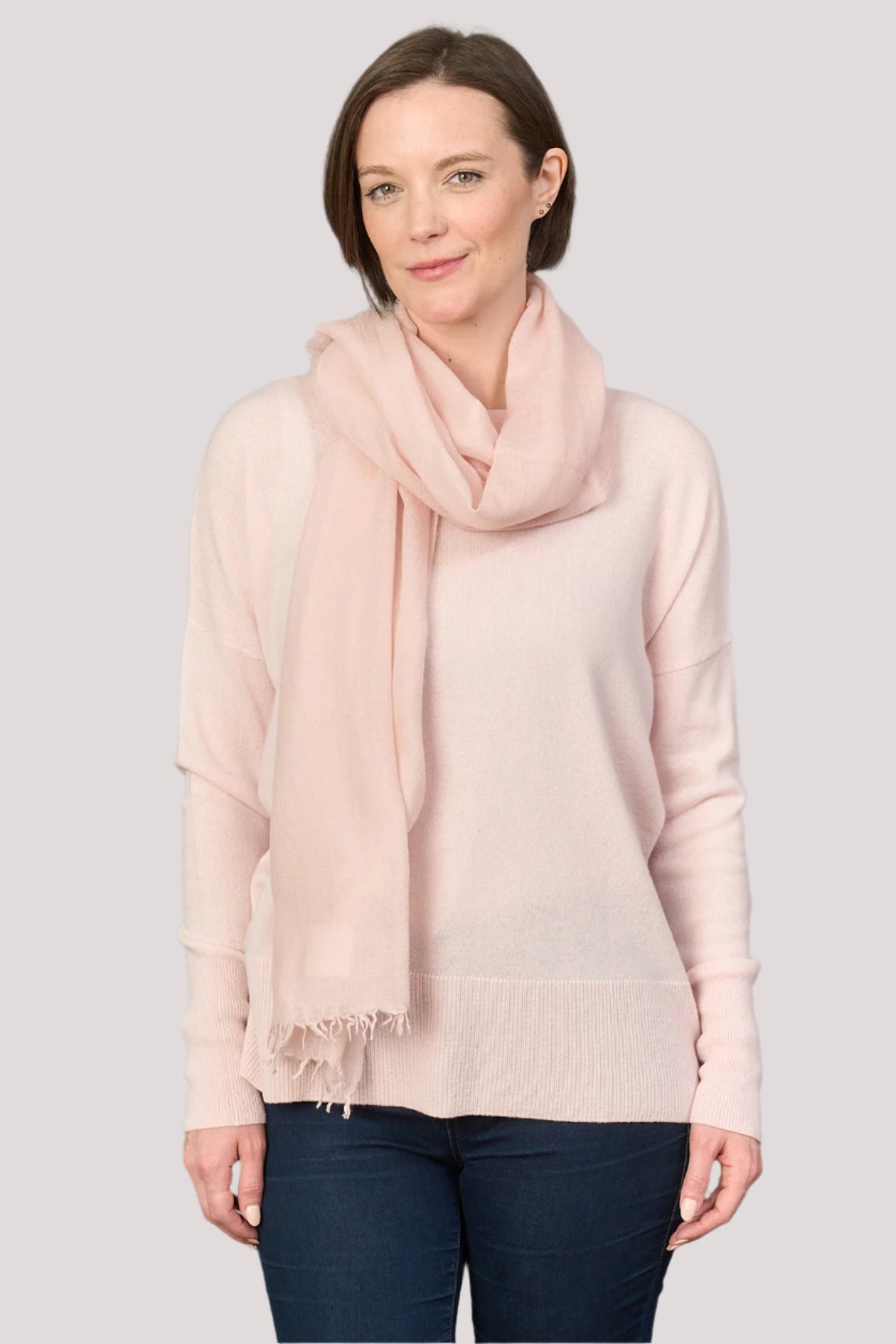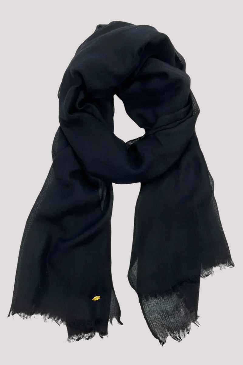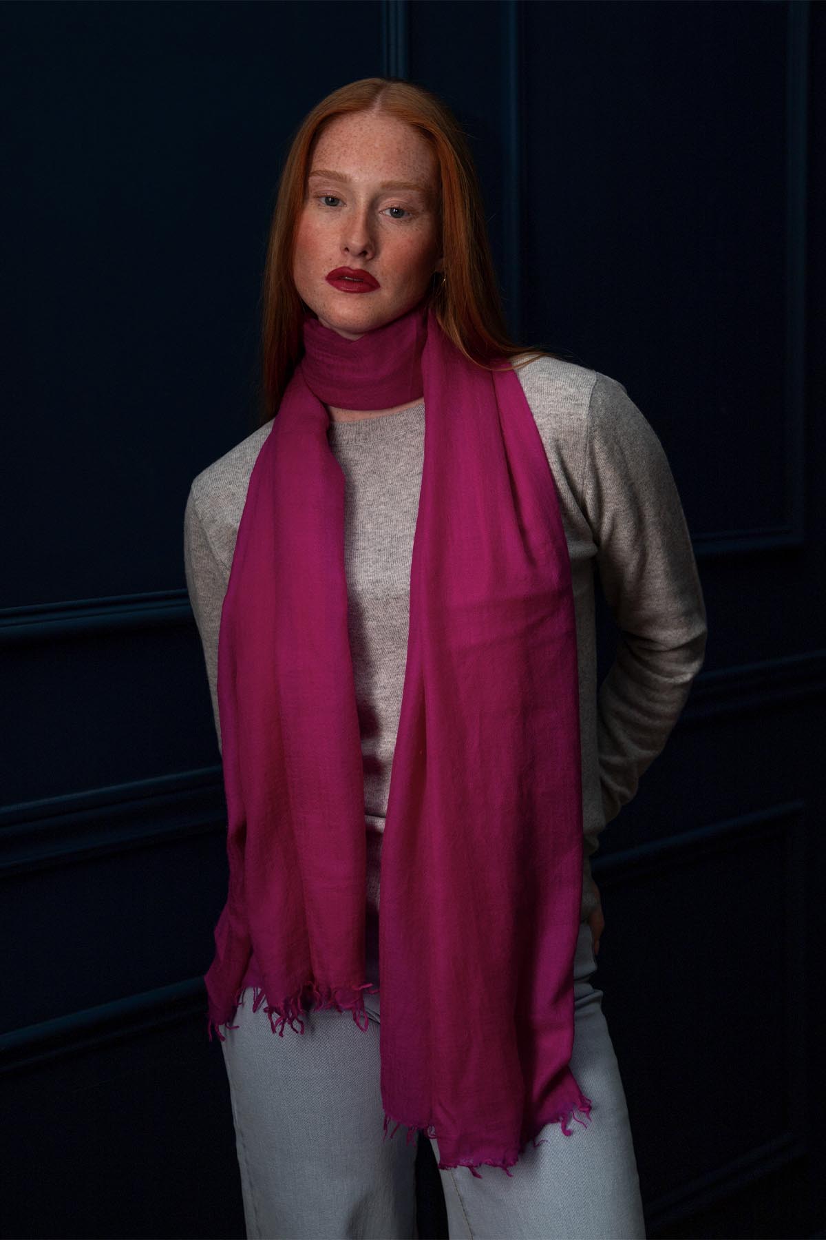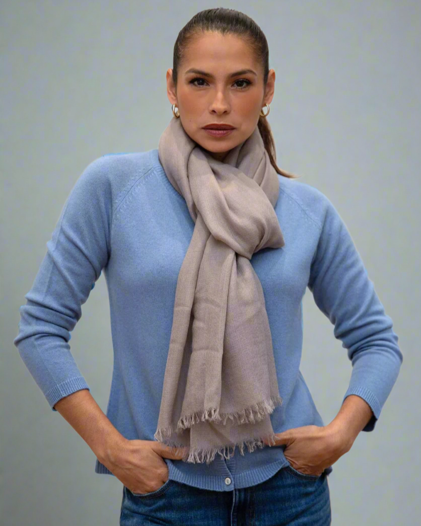 Our diaphanous, super fine cashmere woven scarves are feather-light and a must for spring or fall dressing.  Finished with an eyelash edge, this super-soft scarf can be worn around the neck or as a beautiful shawl.