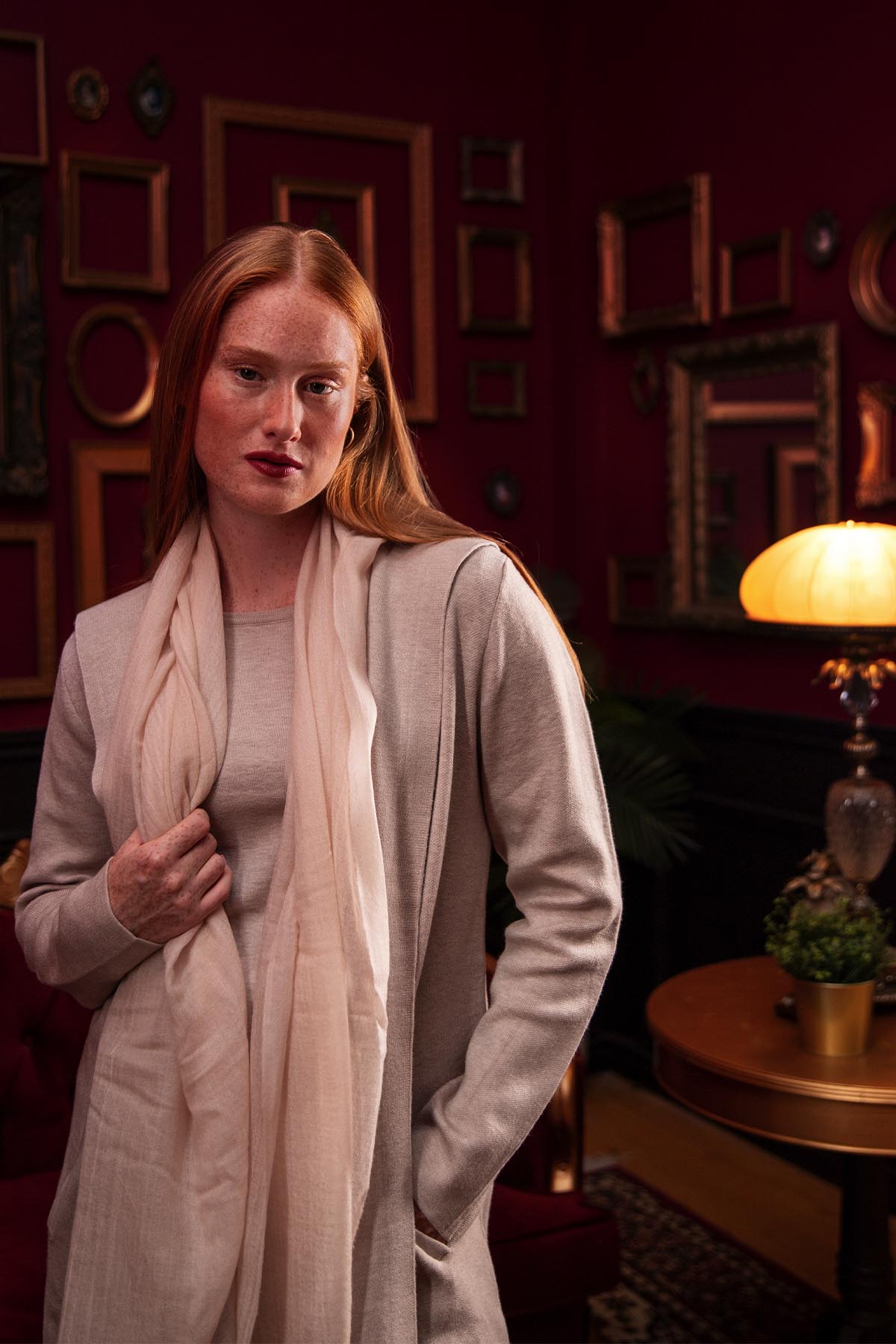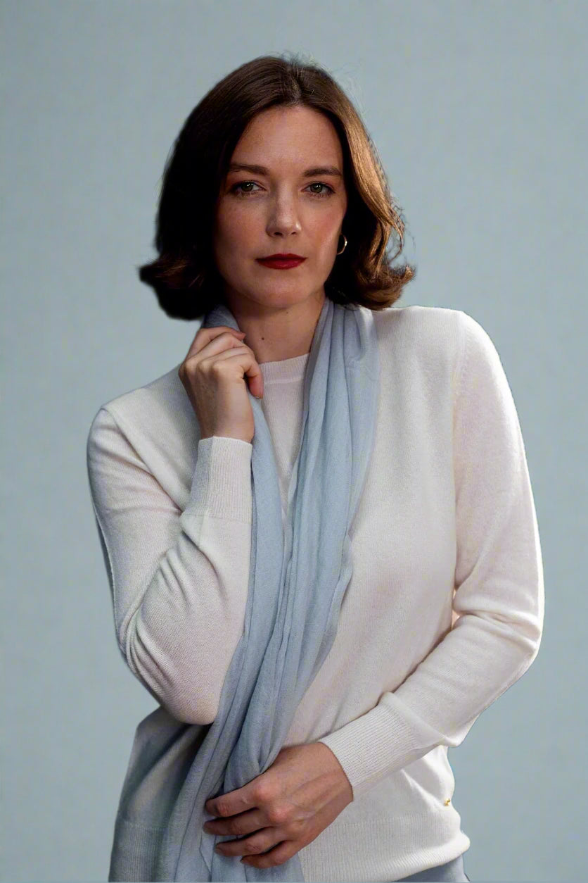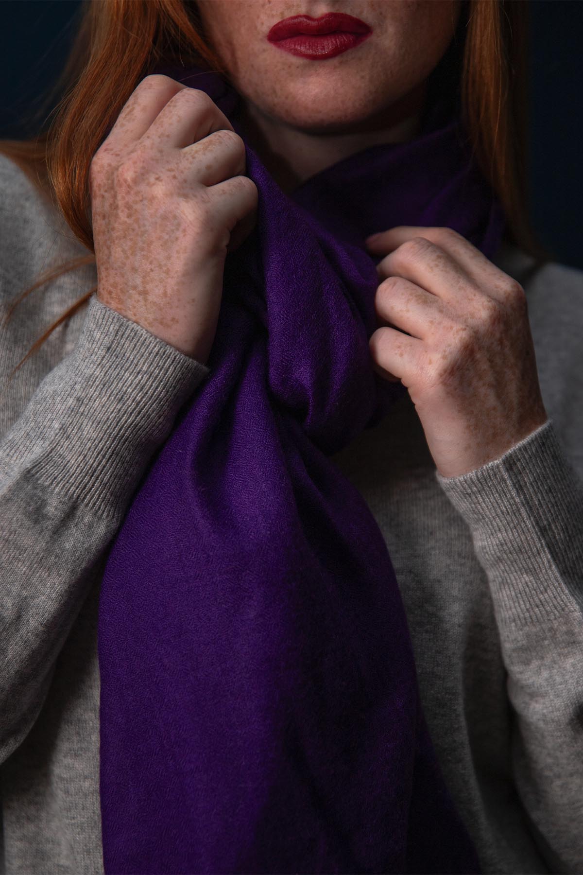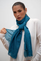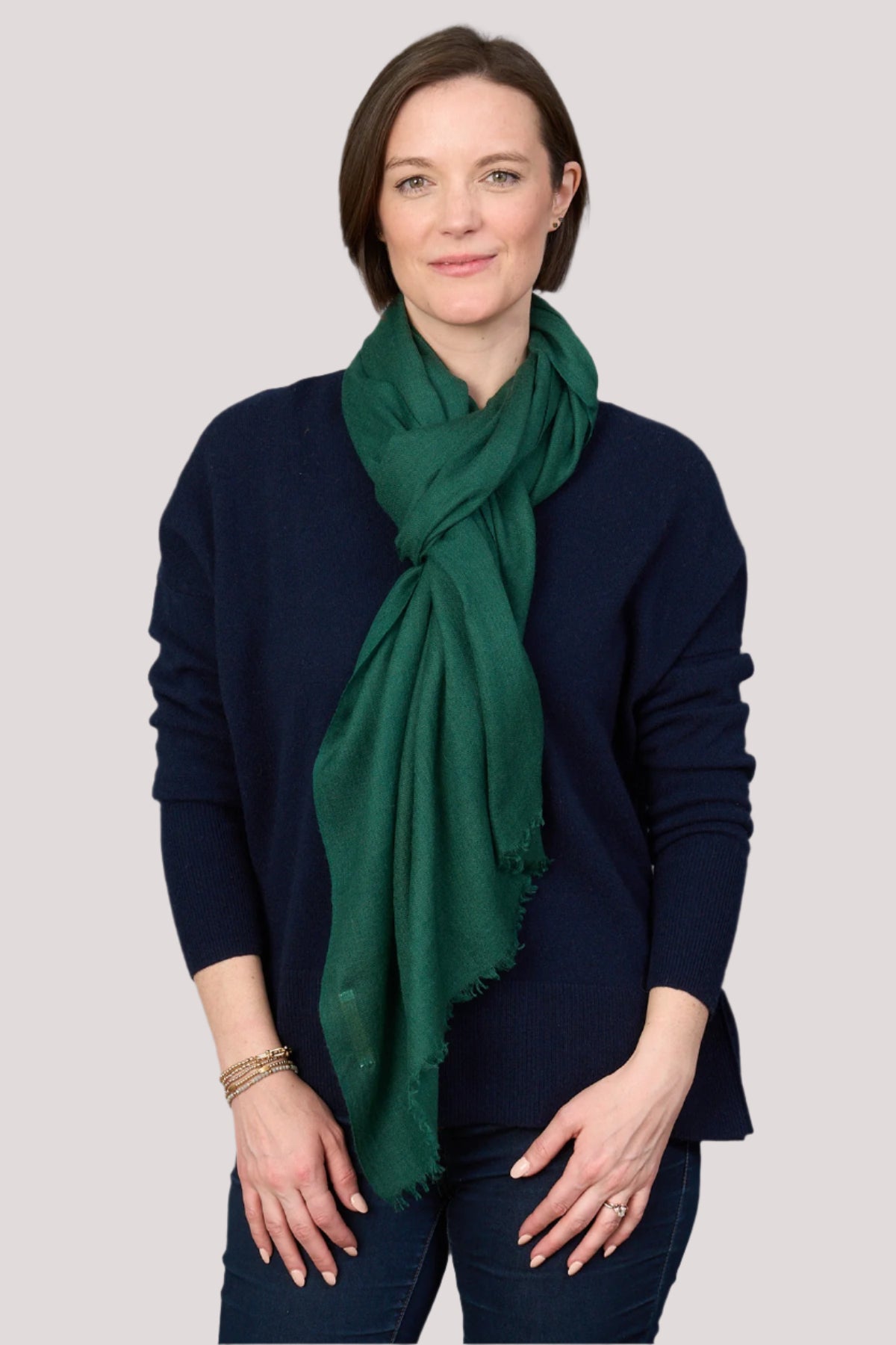Our diaphanous, super fine cashmere woven scarves are feather-light and a must for spring or fall dressing.  Finished with an eyelash edge, this super-soft scarf can be worn around the neck or as a beautiful shawl.