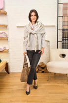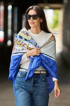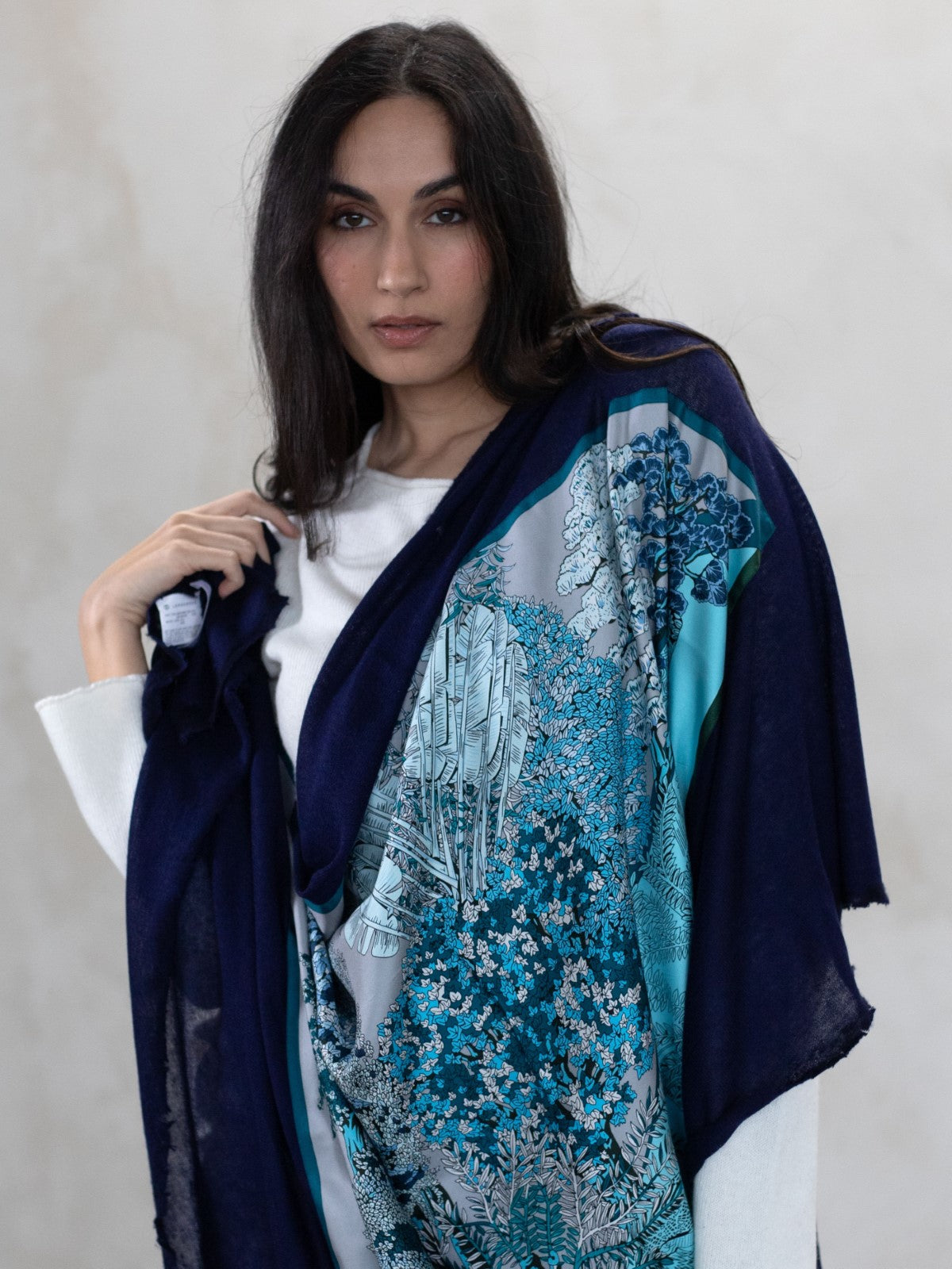 The Sofia wrap is inspired by Italian design. The elegant 100% silk scarf patch adds a unique feature. The silk scarf is carefully hand-sewn onto a silk/cashmere blend of knitted yarn to give a luxurious, soft hand-feel. The combination of silk and cashmere is timeless.