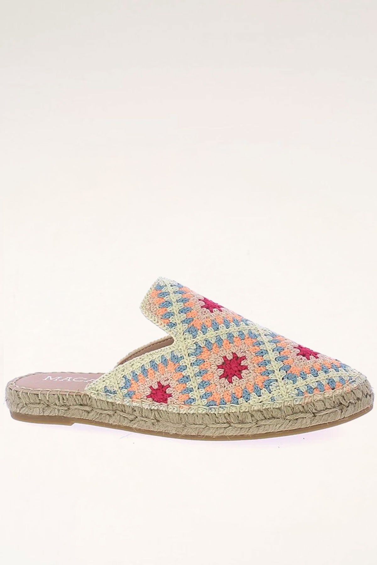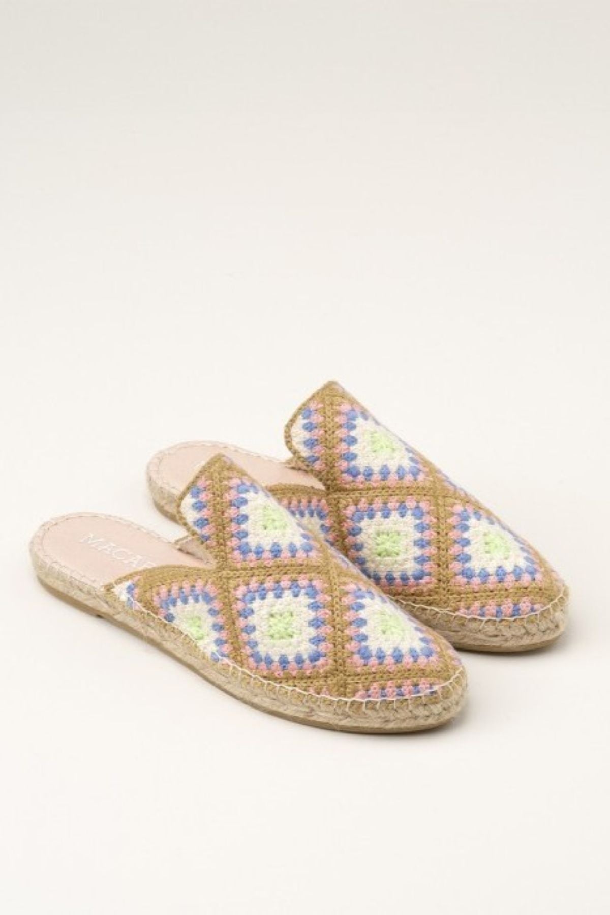 Flat espadrilles in a fun multi-coloured crochet. Perfect for summer! Their mule, slip on design make them easy to throw on with everything.