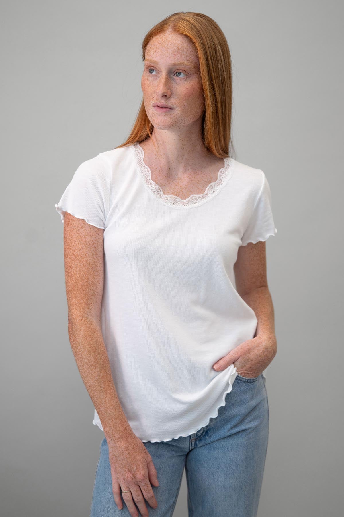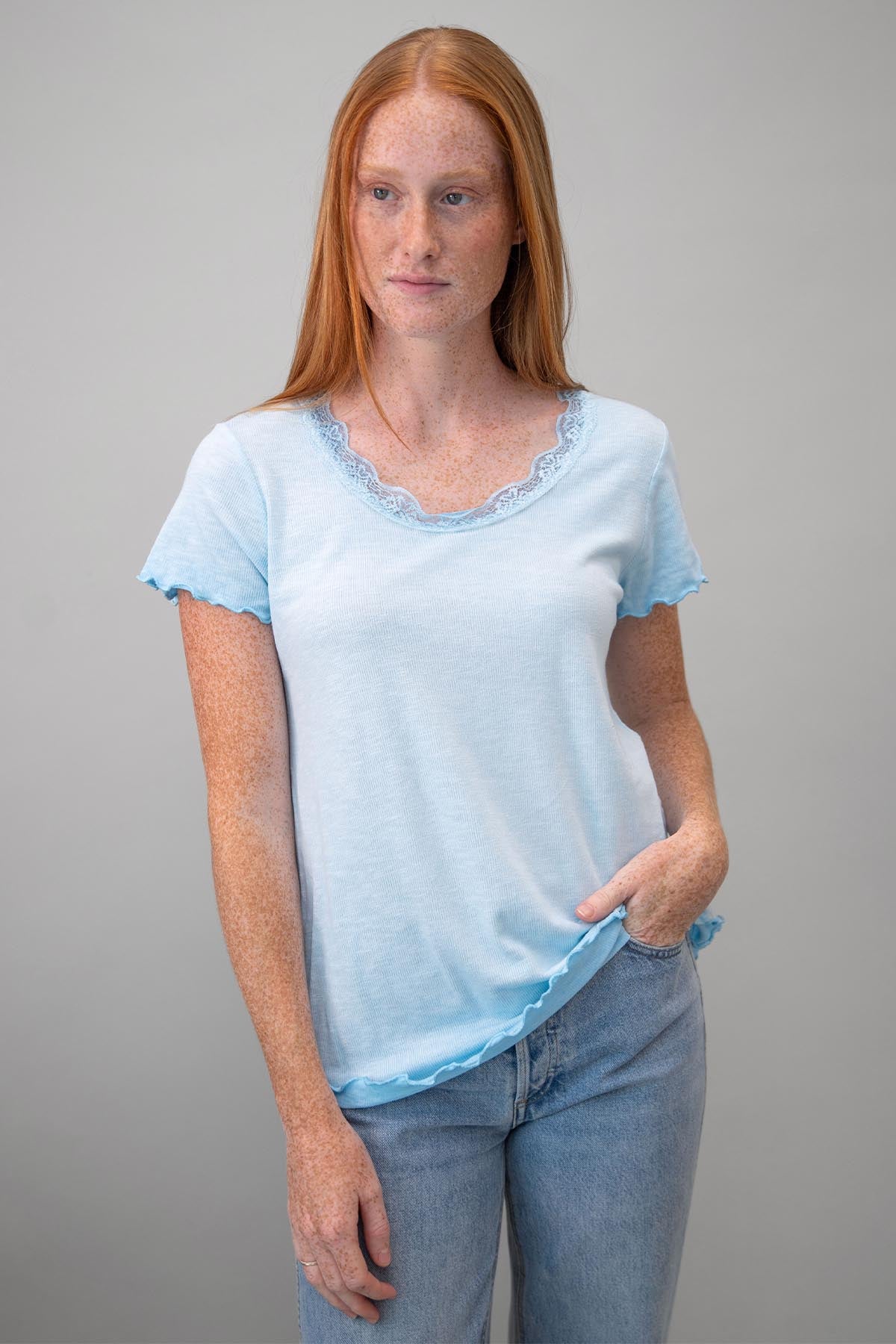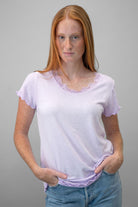 This cotton crew tee features delicate lace trim along the neck, sleeves, and bottom, adding a flirty touch to a classic silhouette. Made from soft, 100% cotton with a slight stretch, it offers comfort and a flattering fit that hits right at the upper hip. Perfect for adding a bit of charm to your everyday look!