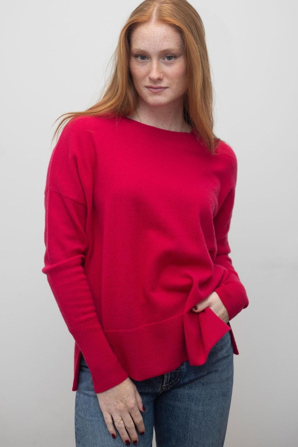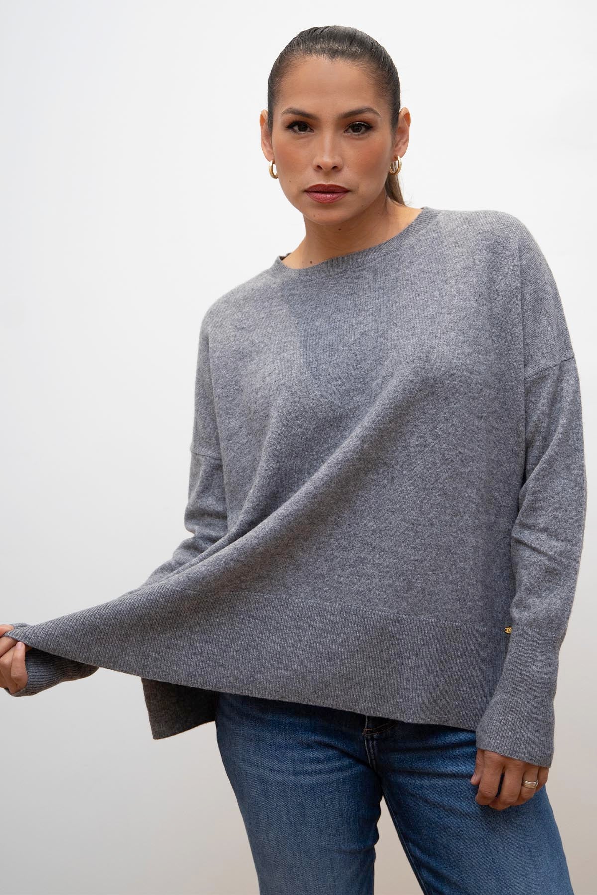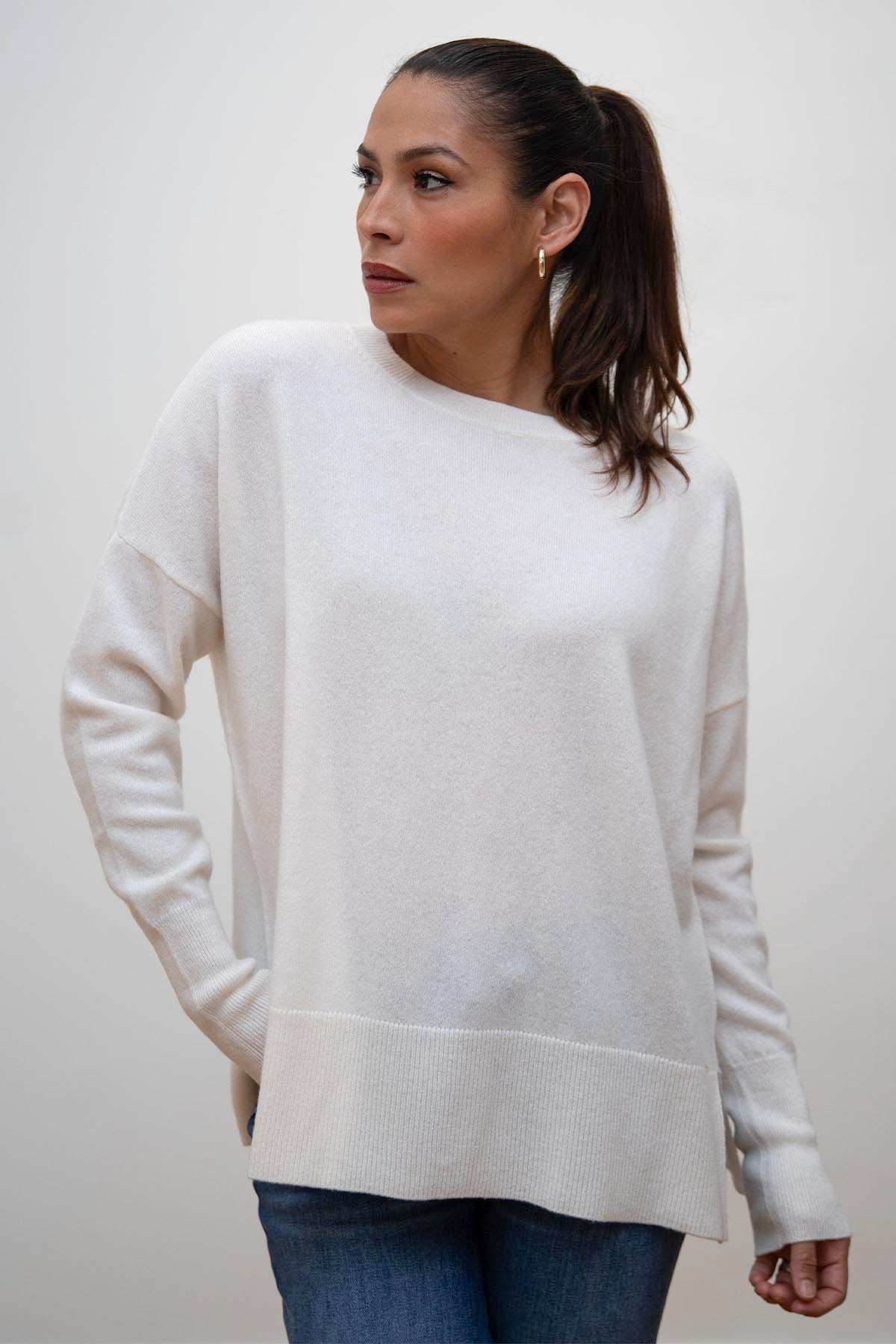 Our Modern Crew w/slit is made with the finest cashmere, and is the cold weather's best friend. It has a comfortable crew neck with a relaxed fit. The arms and bottom have a ribbed hem, featuring side slits on both sides. Pair with our cashmere Cuff Pant for the ultimate in coziness!