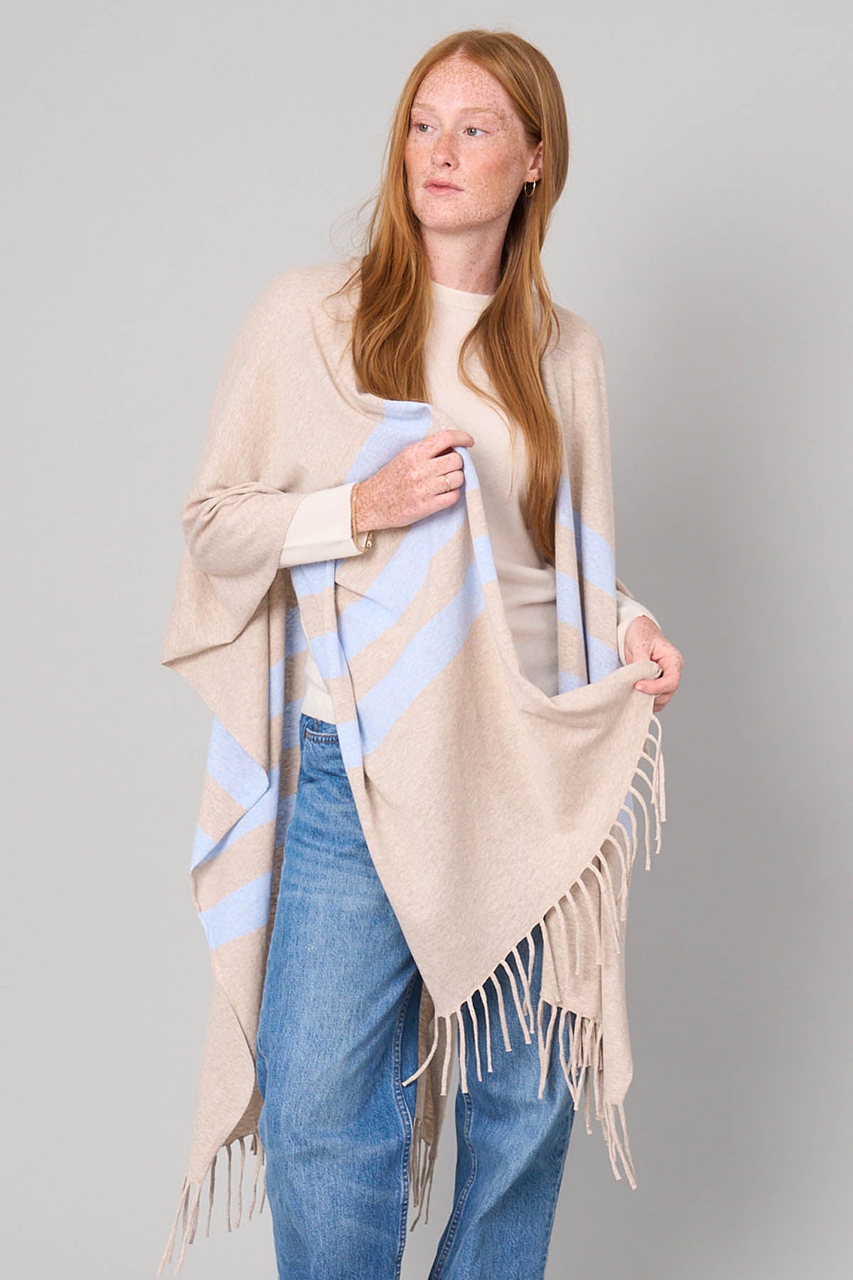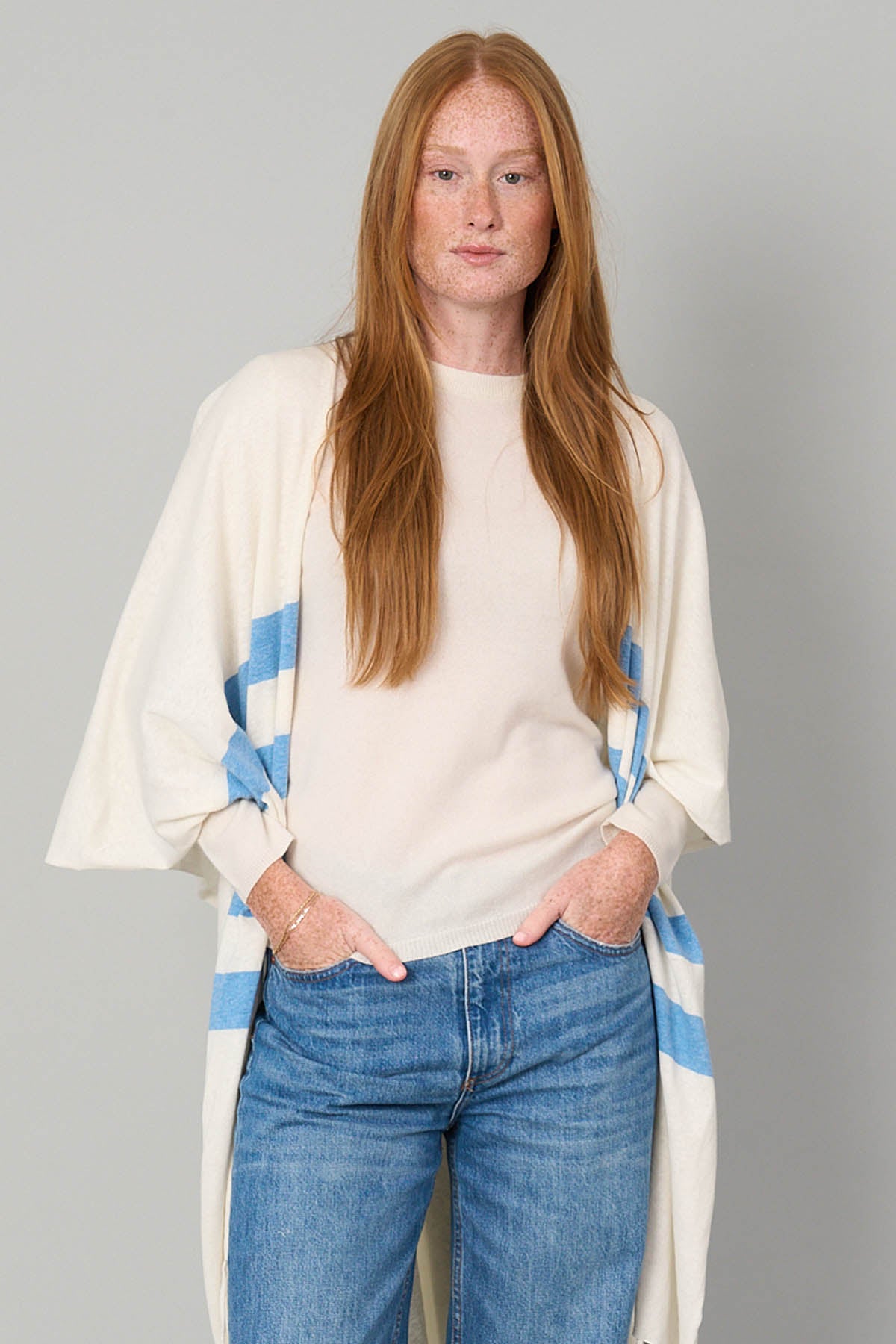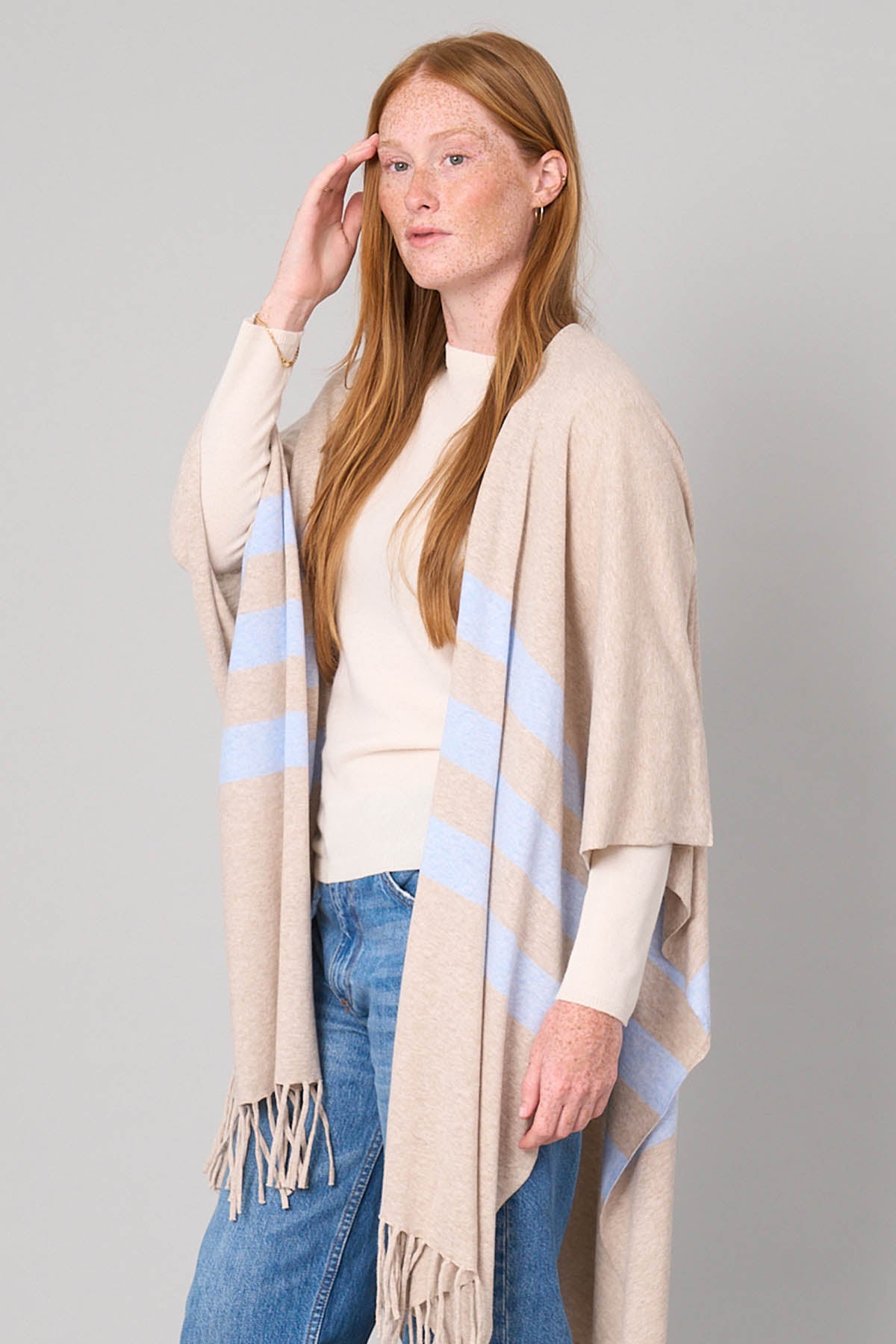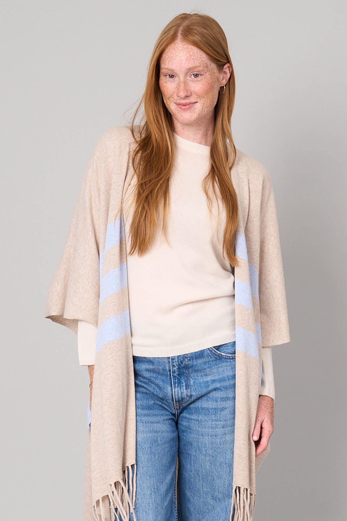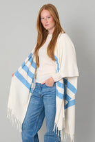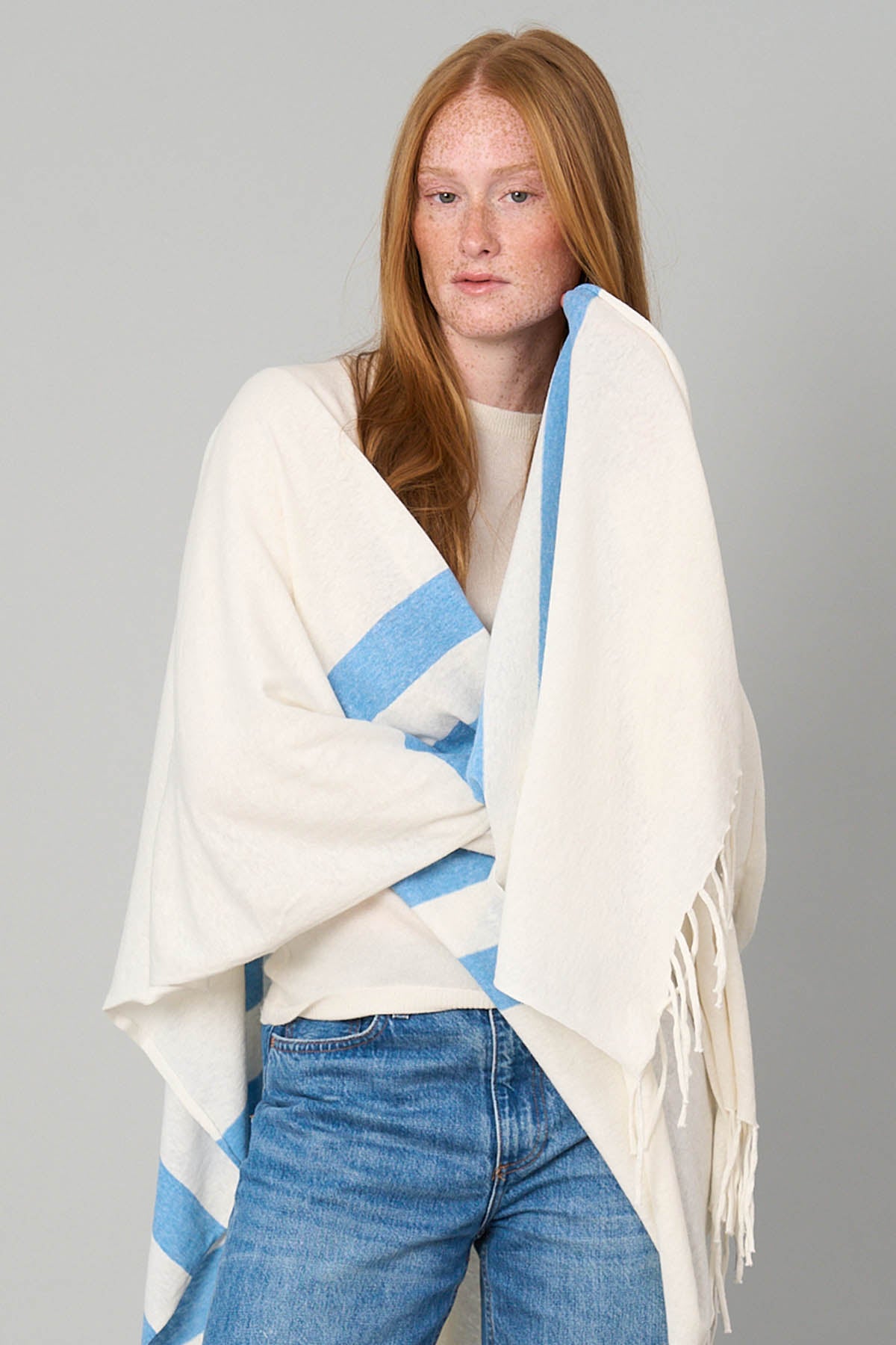 Wrap yourself in effortless style with this cotton-linen blend that's as comfortable as it is chic. Knee-grazing length and playful contrasting stripes keep things interesting, while long fringe adds movement. Perfect for layering over dresses, tossing over swimwear, or wearing with your favourite jeans. Lightweight and breathable.