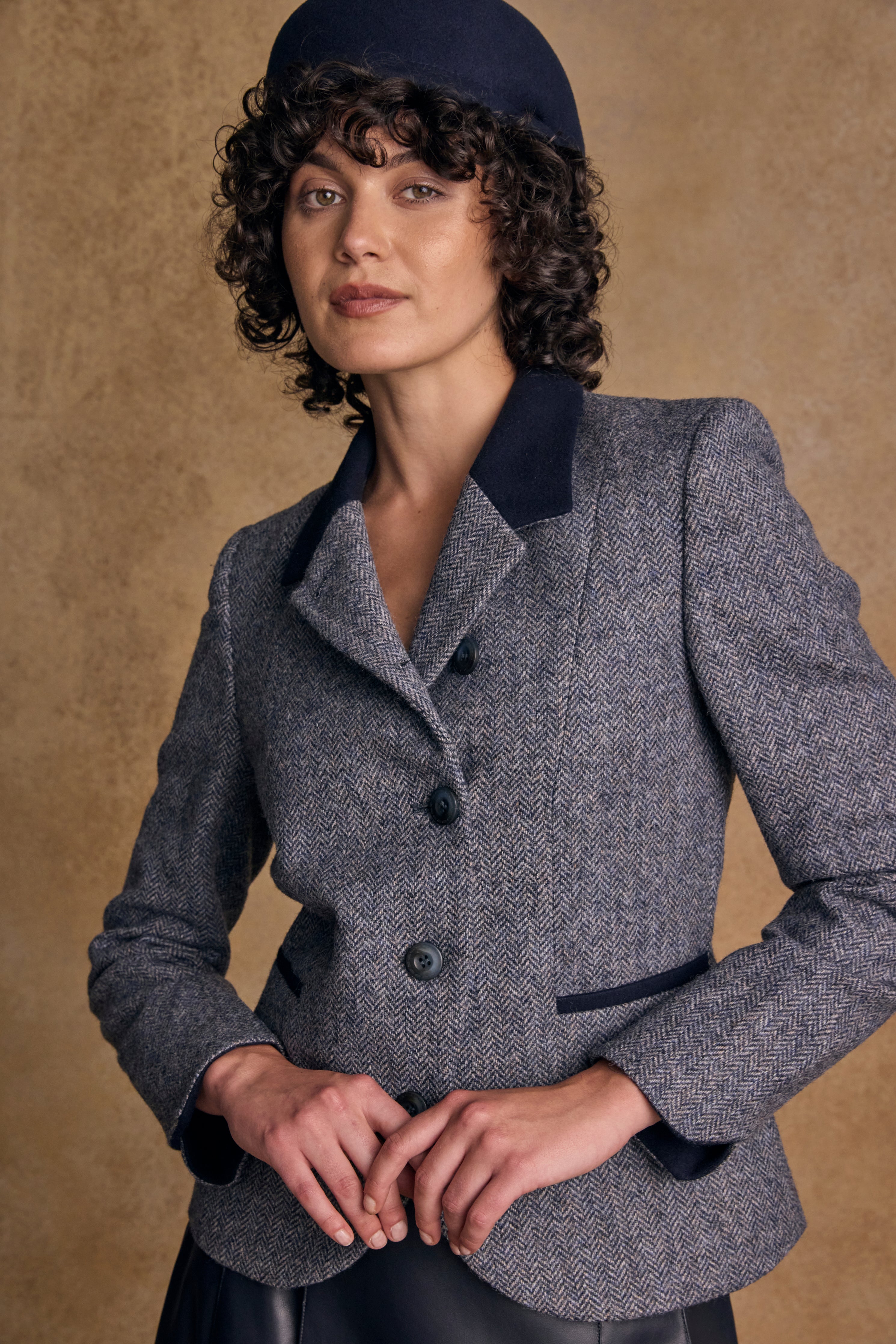 Dry clean only to maintain the fabric’s integrity and rich texture. For long-term storage, hang in a cedar-lined wardrobe or place in a cool, dry space away from moisture. Use a breathable garment bag to protect against moths and preserve the integrity of the tweed.