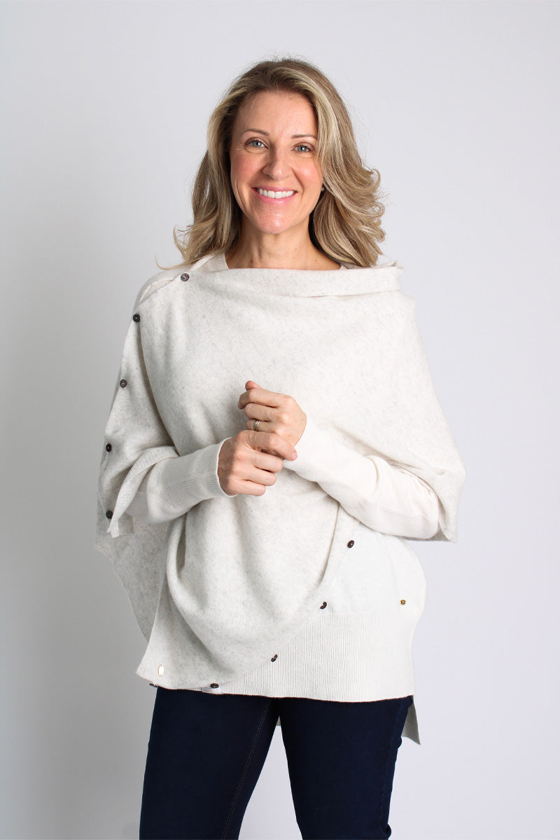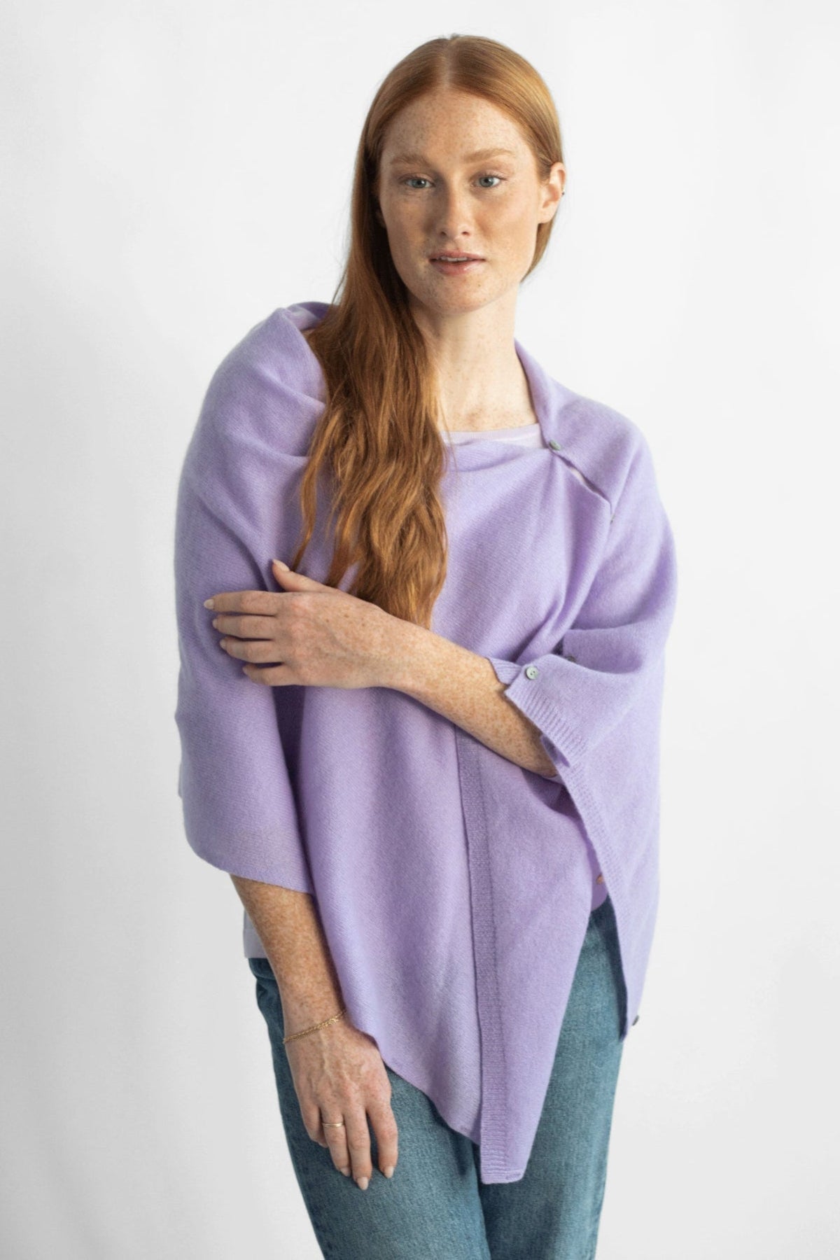 Our Peony Poncho can be worn buttoned as a poncho or unbuttoned as a scarf or shawl. It is a popular Lemonwood piece that is great for all seasons. Wear as a scarf with your favourite coat during winter or as a shawl over a dress for Spring. It is a shorter style in a rectangular shape that is ideal for any weather, great over leggings, a beautiful addition to any evening look, and a cozy travel companion.