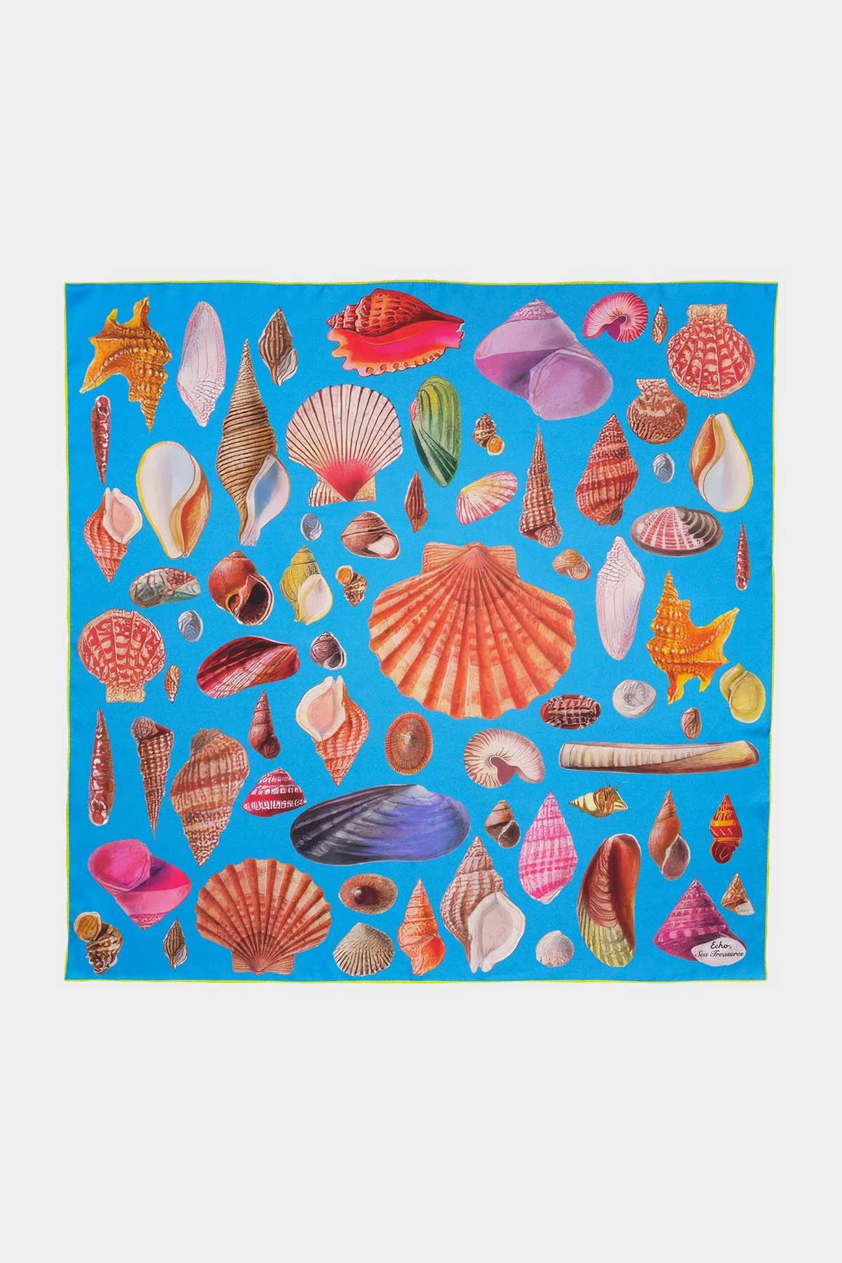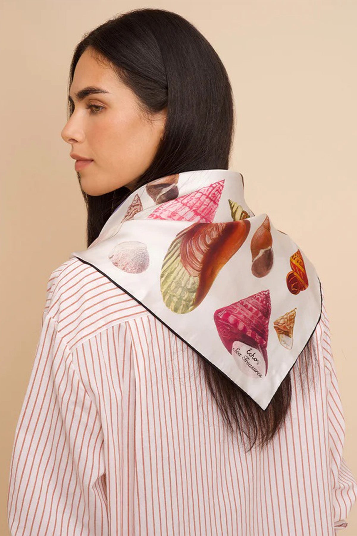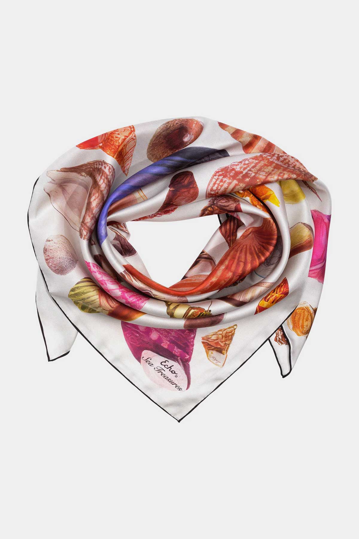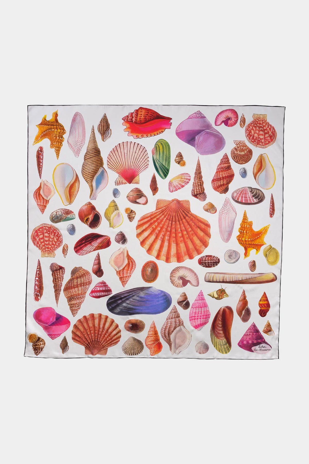 A collection of colorful shells adorn the newest addition to the Echo Series Collection of luxe silk squares. Sea treasures, indeed.
