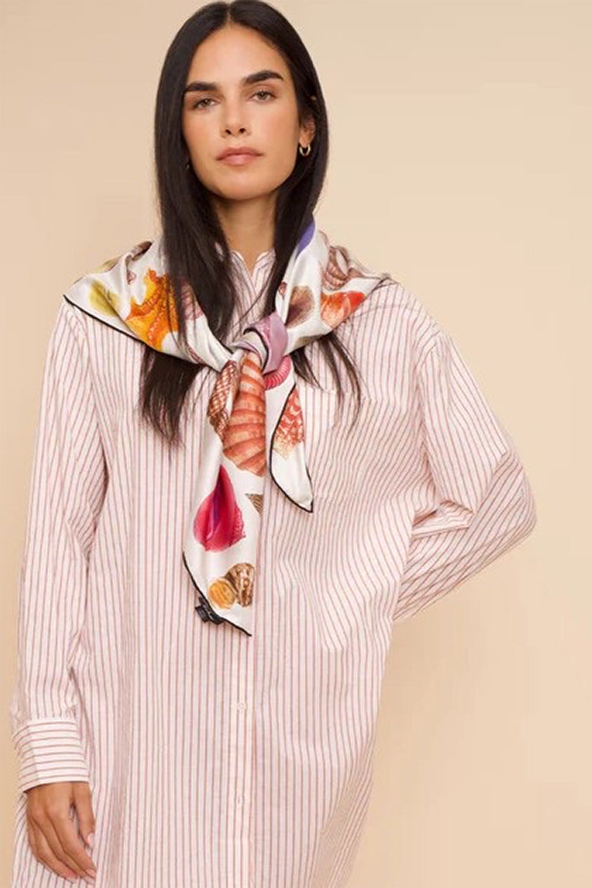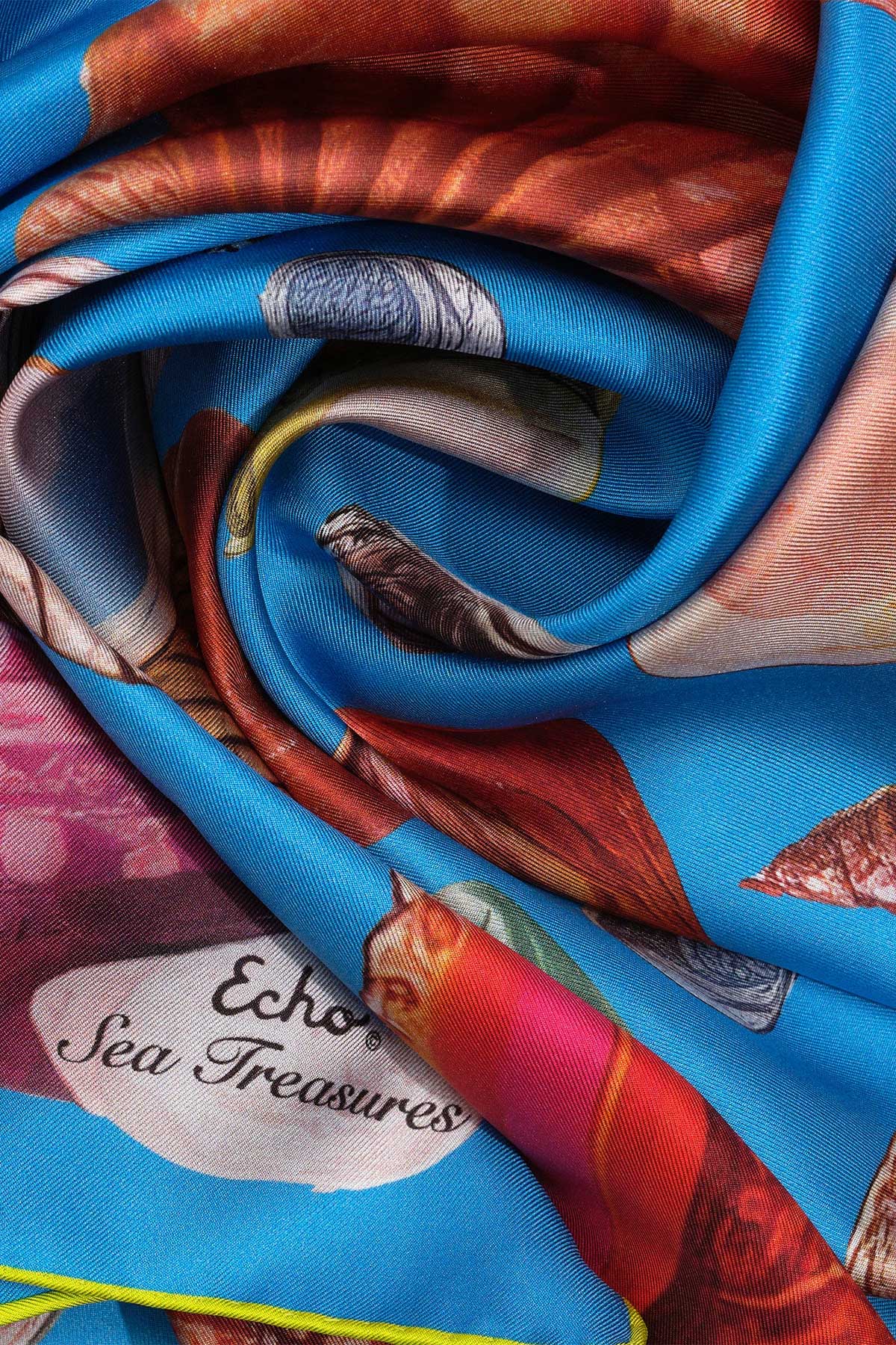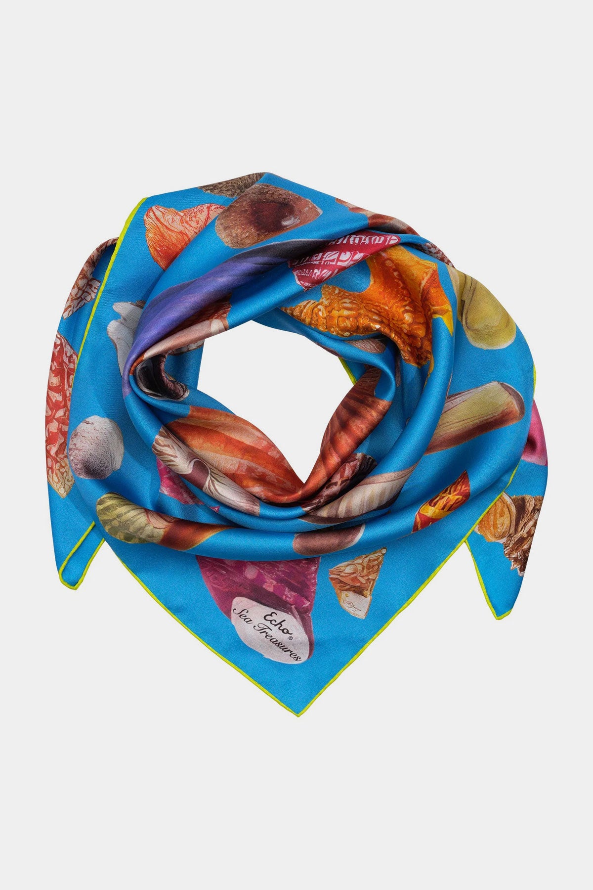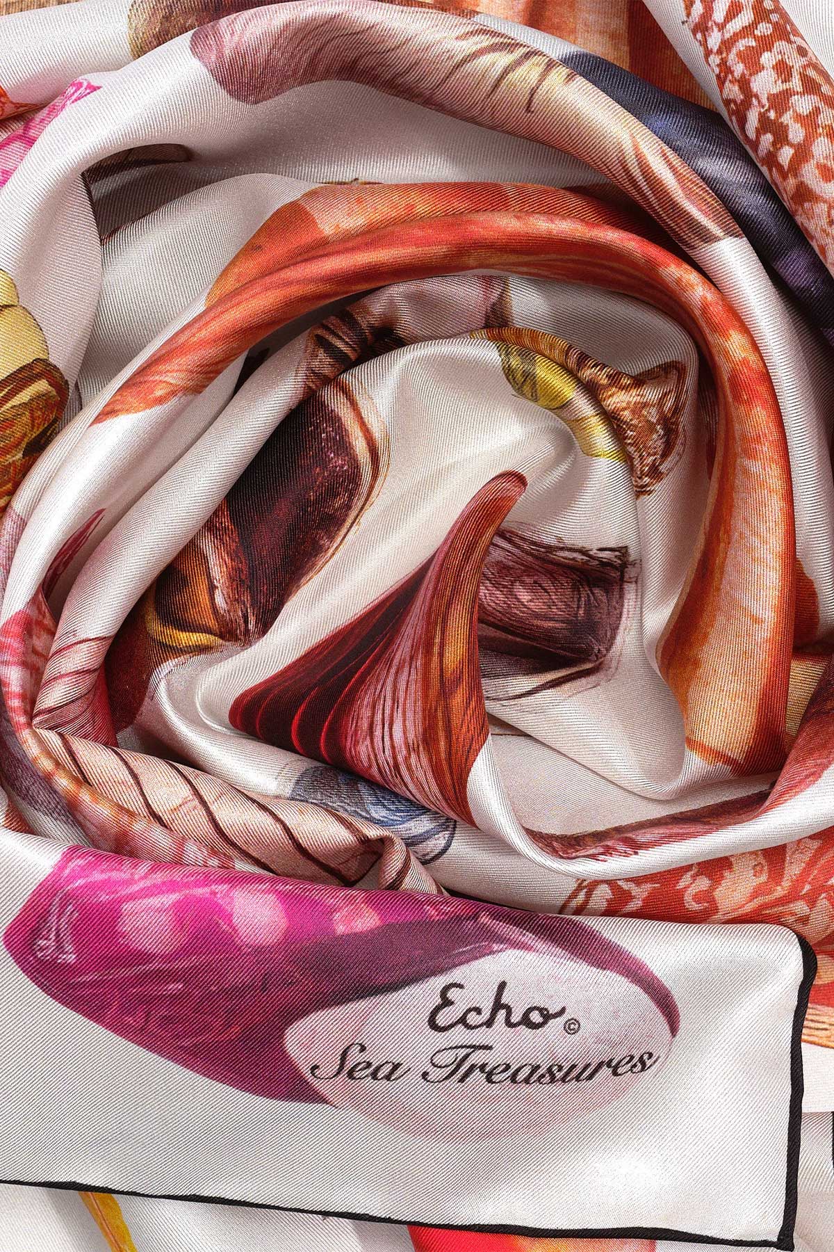 A collection of colorful shells adorn the newest addition to the Echo Series Collection of luxe silk squares. Sea treasures, indeed.