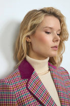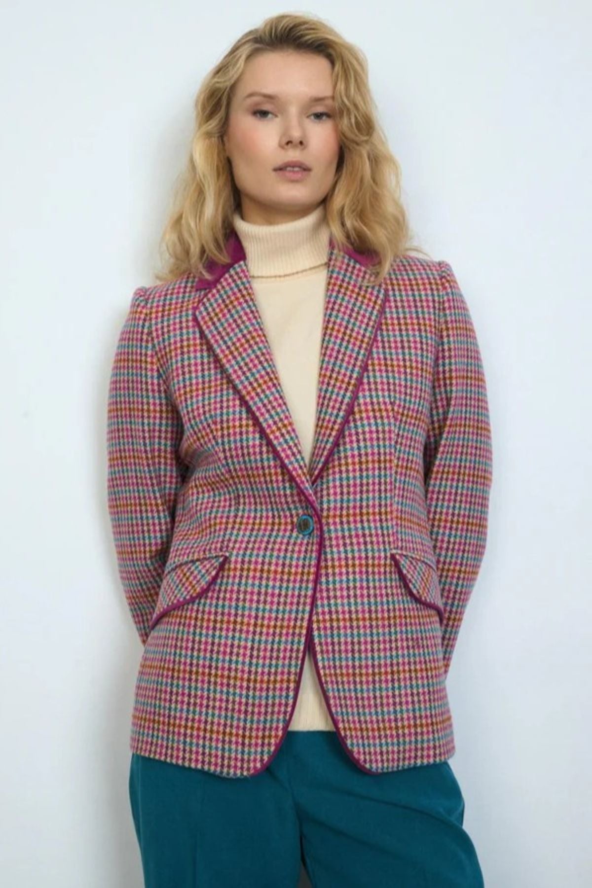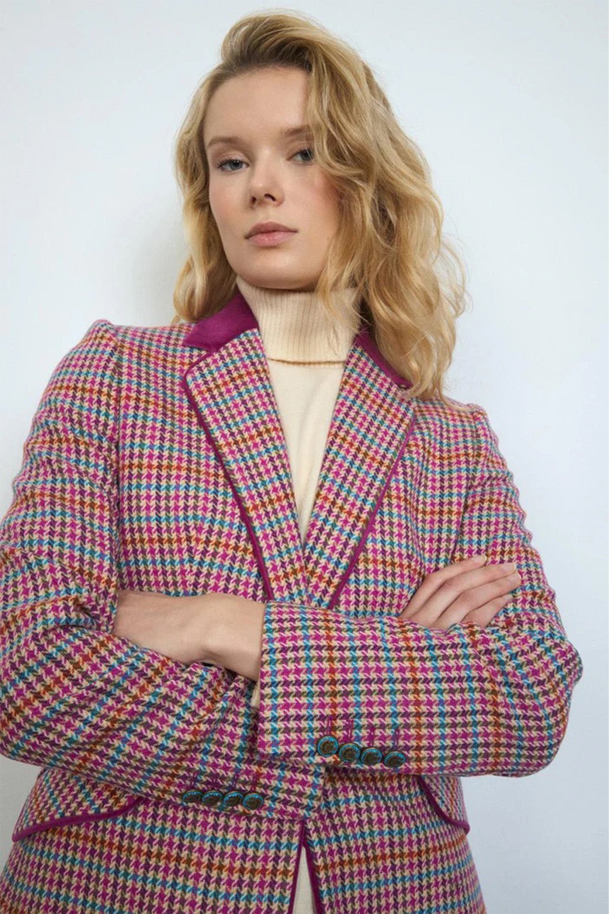 This hip-length, fitted blazer features a timeless small houndstooth print, designed with a straight cut that ensures a sleek silhouette. It boasts a refined notch lapel collar enhanced by elegant velvet trim, adding a touch of luxury to the classic design. The blazer secures with a unique, decorative metal button, while the faux pockets are adorned with matching velvet flaps. Long sleeves include a false button closure with a slight opening, finished with four coordinating decorative metal buttons at the cuffs. A straight hemline without a split maintains its polished, streamlined appearance.