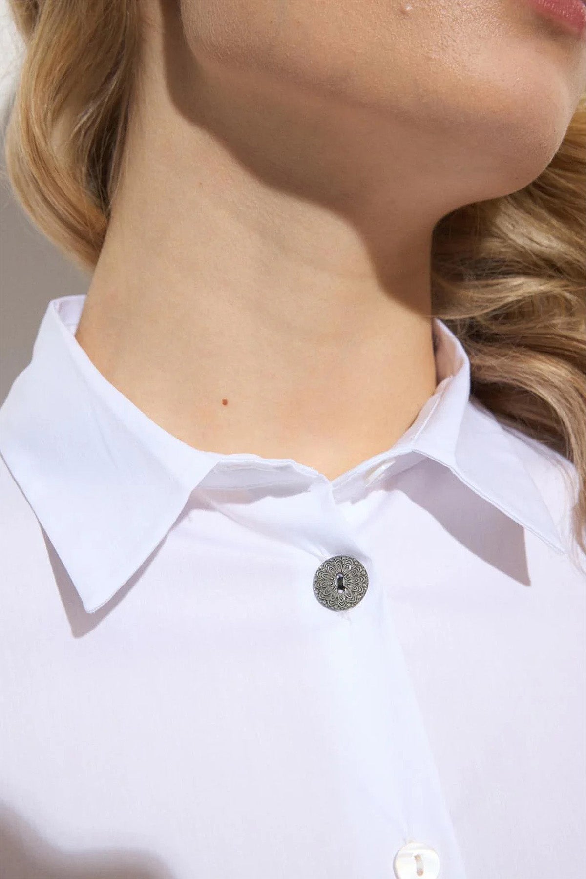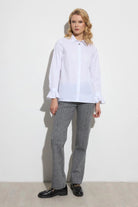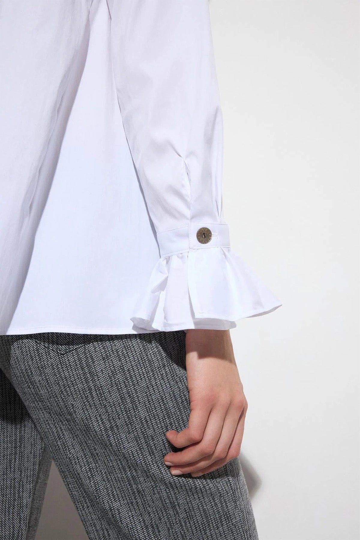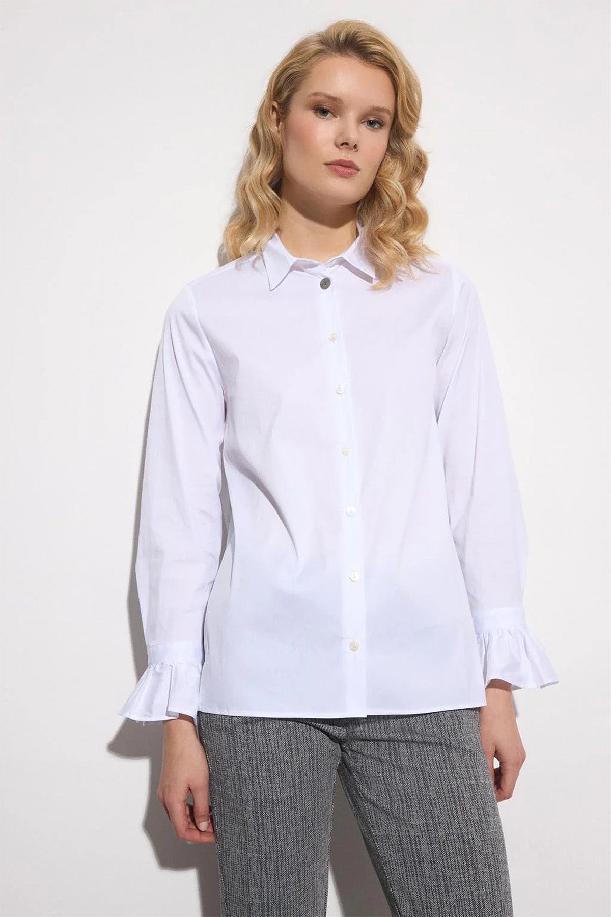 Elegant blouse featuring a refined poplin fabric that offers a crisp and polished look. Designed with a classic shirt collar, it showcases a straight silhouette enhanced by a tone-on-tone button closure, highlighted by a decorative, metallic top button for a touch of sophistication. The long sleeves are gracefully finished with buttoned cuffs and delicate ruffle accents, adding a feminine detail.