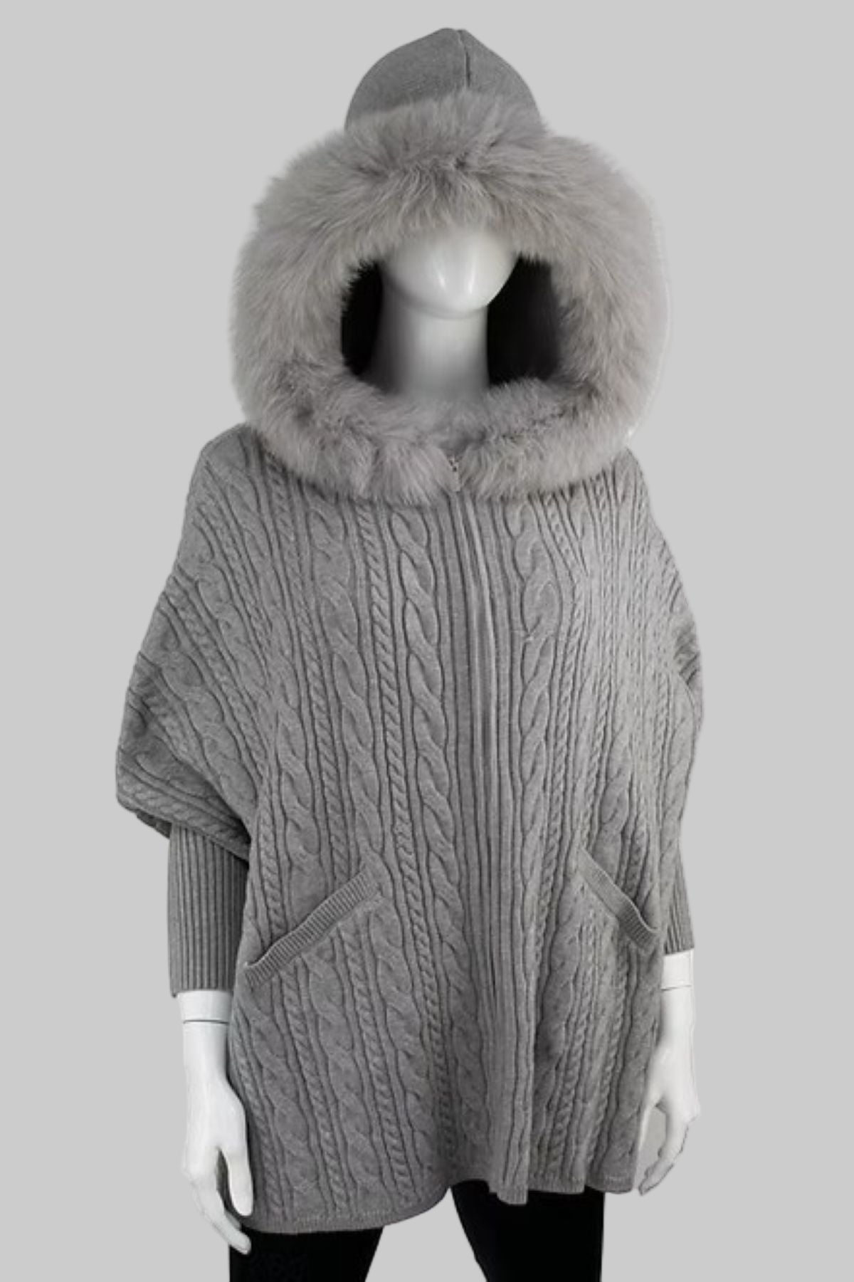 Luxurious cable knit poncho with hood trimmed in real fox fur. Features a zipper closure in the front, front diagonal pockets, and a slightly shorter sleeve that is more fitted on the forearm.