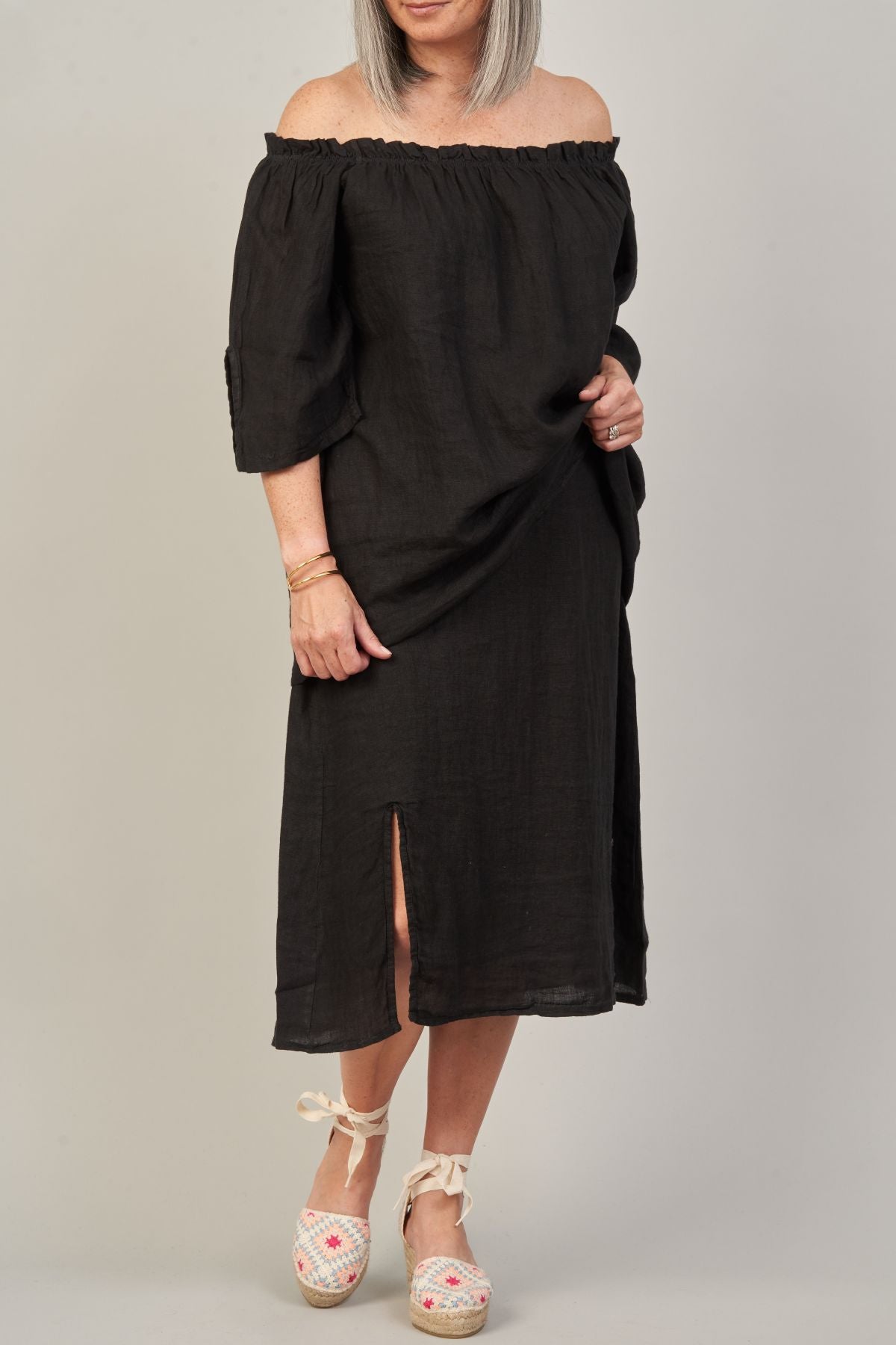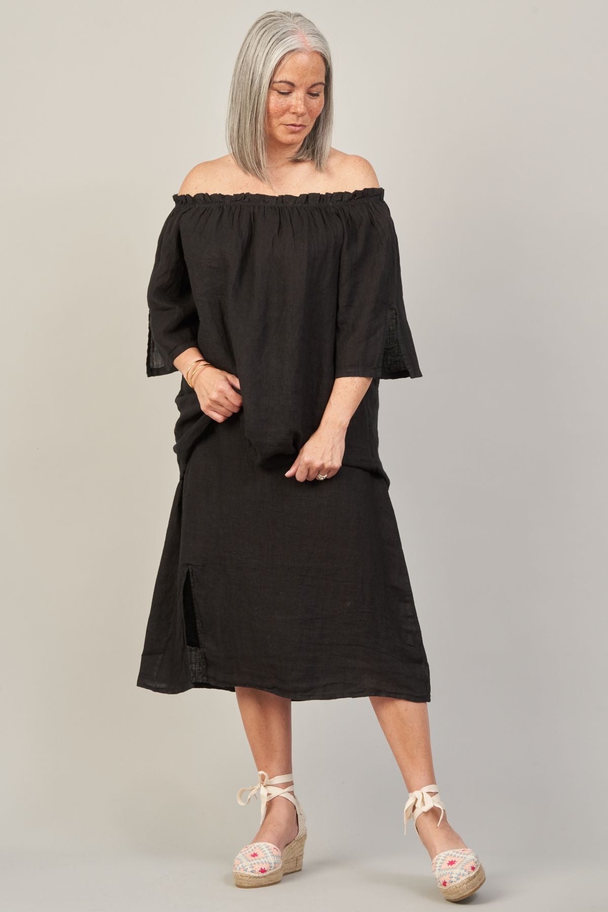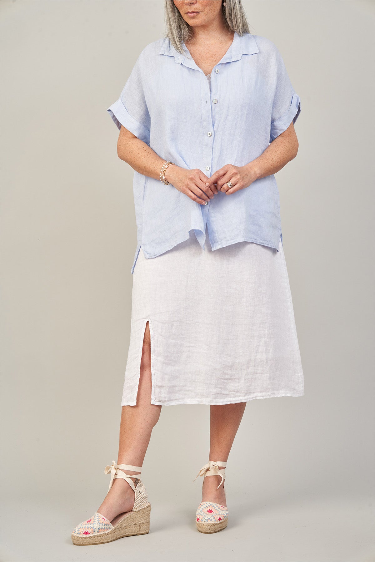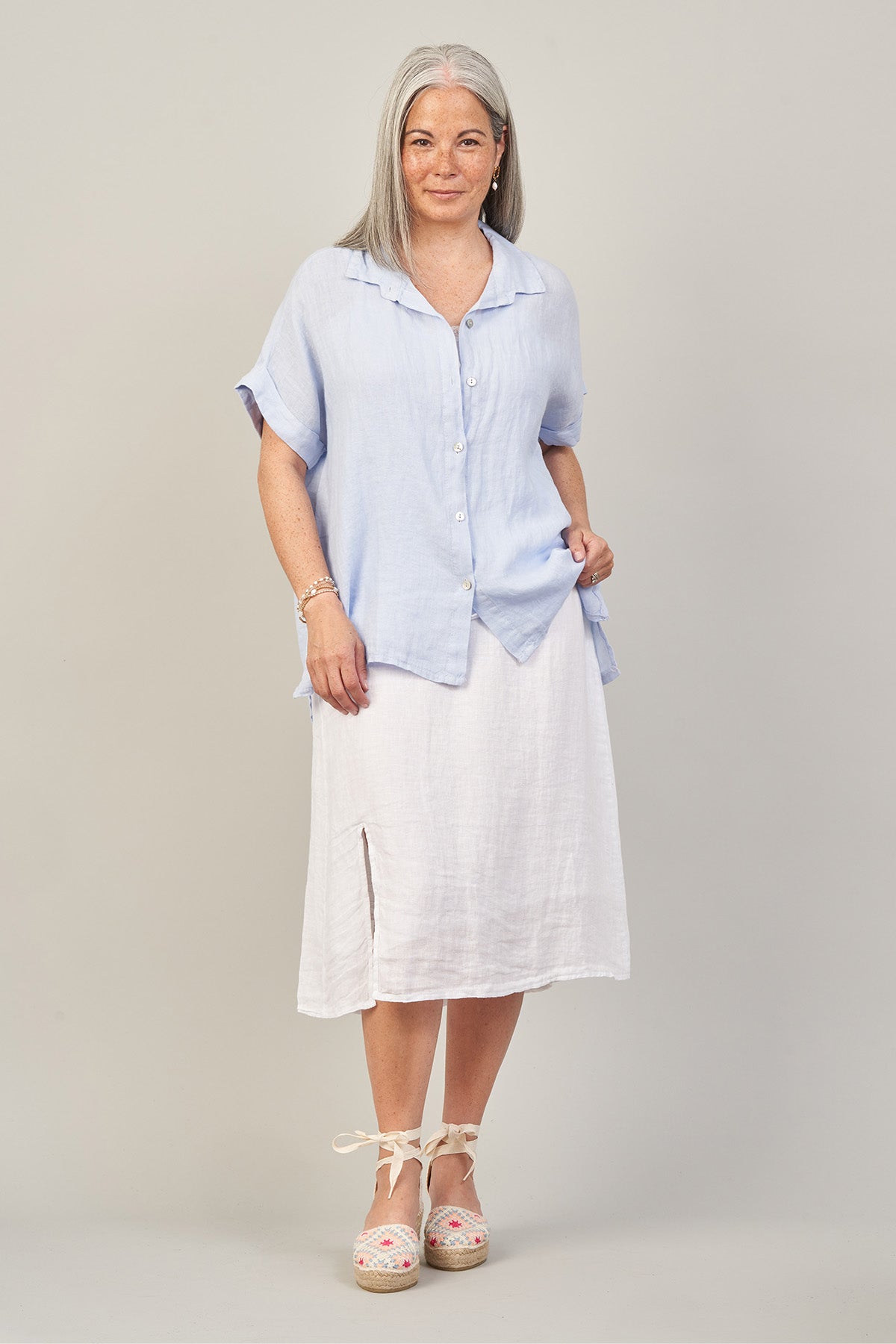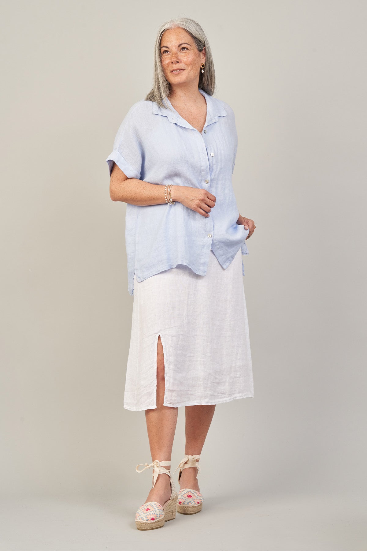 A contemporary A-line silhouette, midi length, with a front side slit and gathered elastic waistband. Perfect with a simple t-shirt or pair it with one of our linen tops.