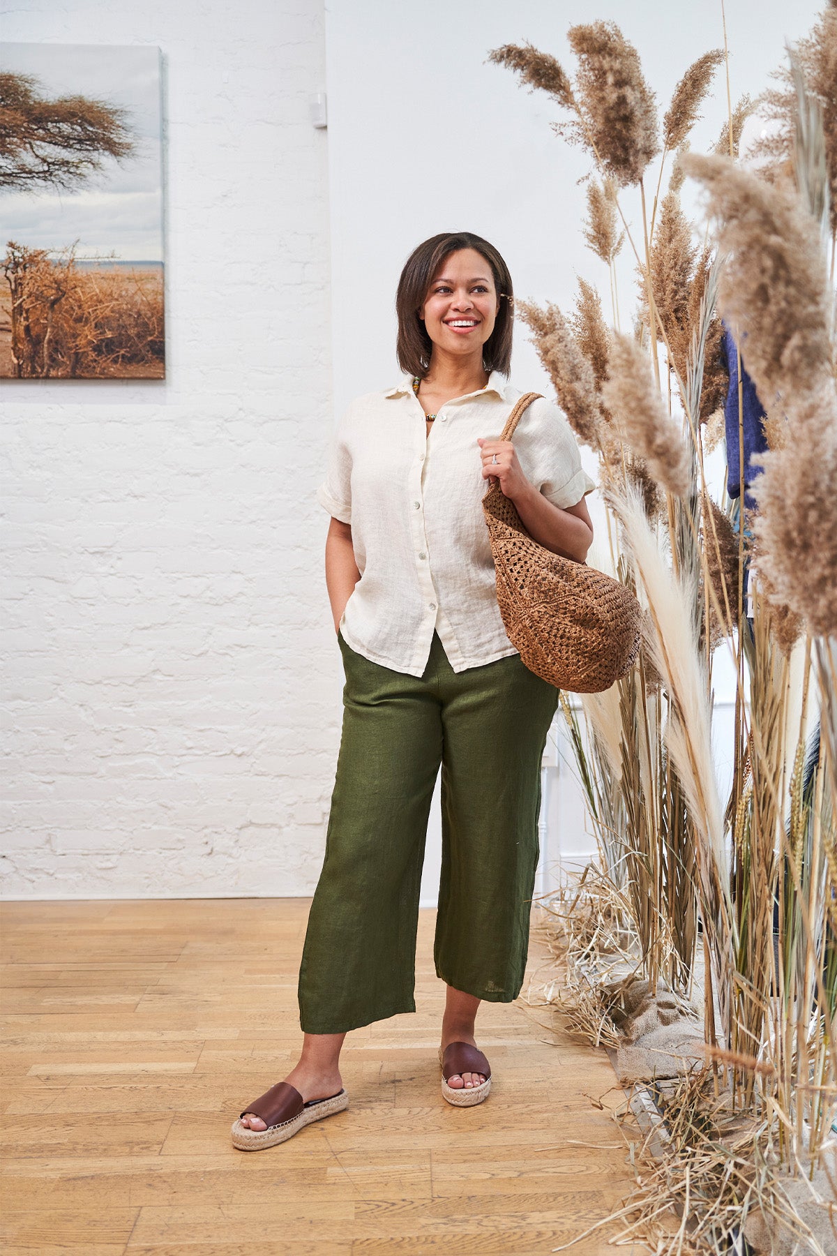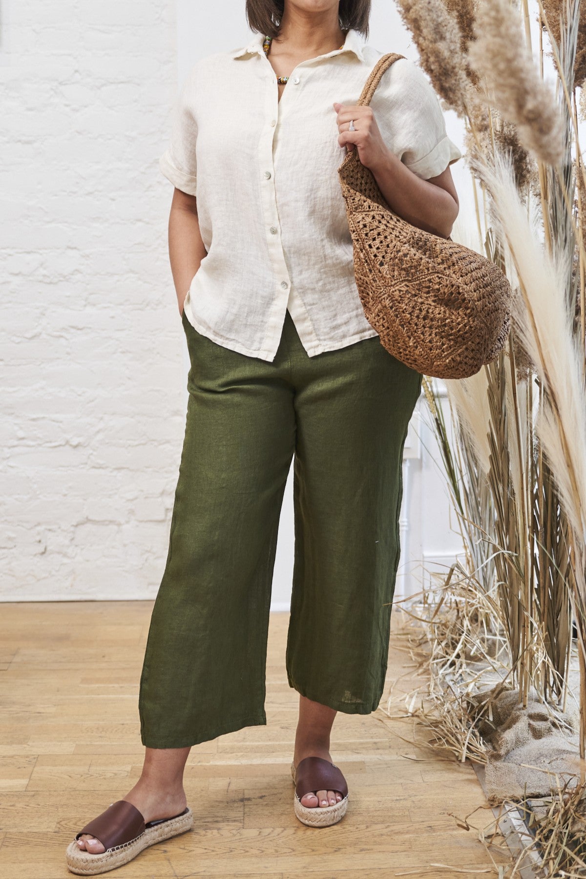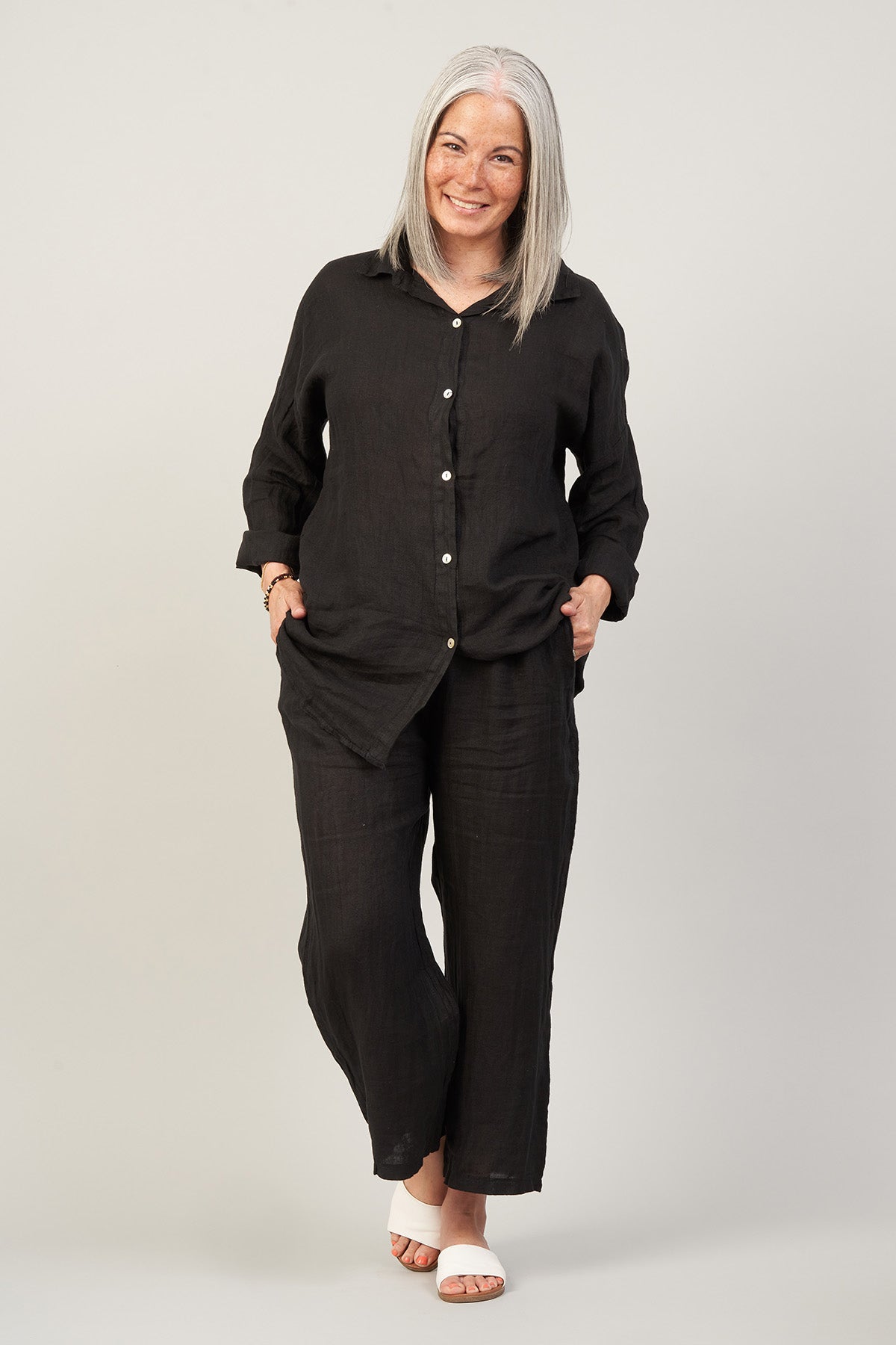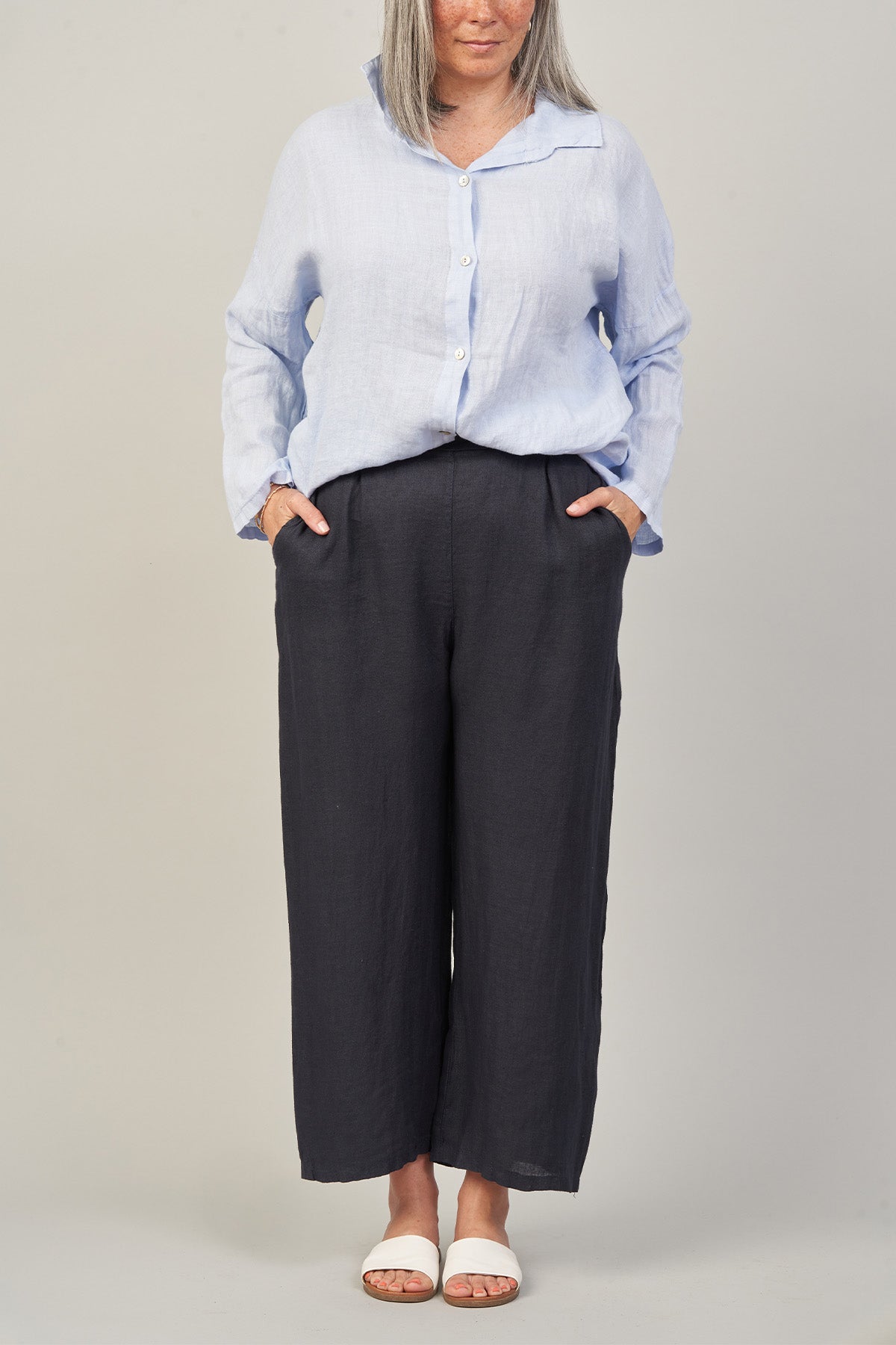 A simple wide leg pull on pant, with a flat front, gathered waist and side pockets. Comfortable and cool for the long summer days. Available in all of your favourite neutral shades.