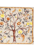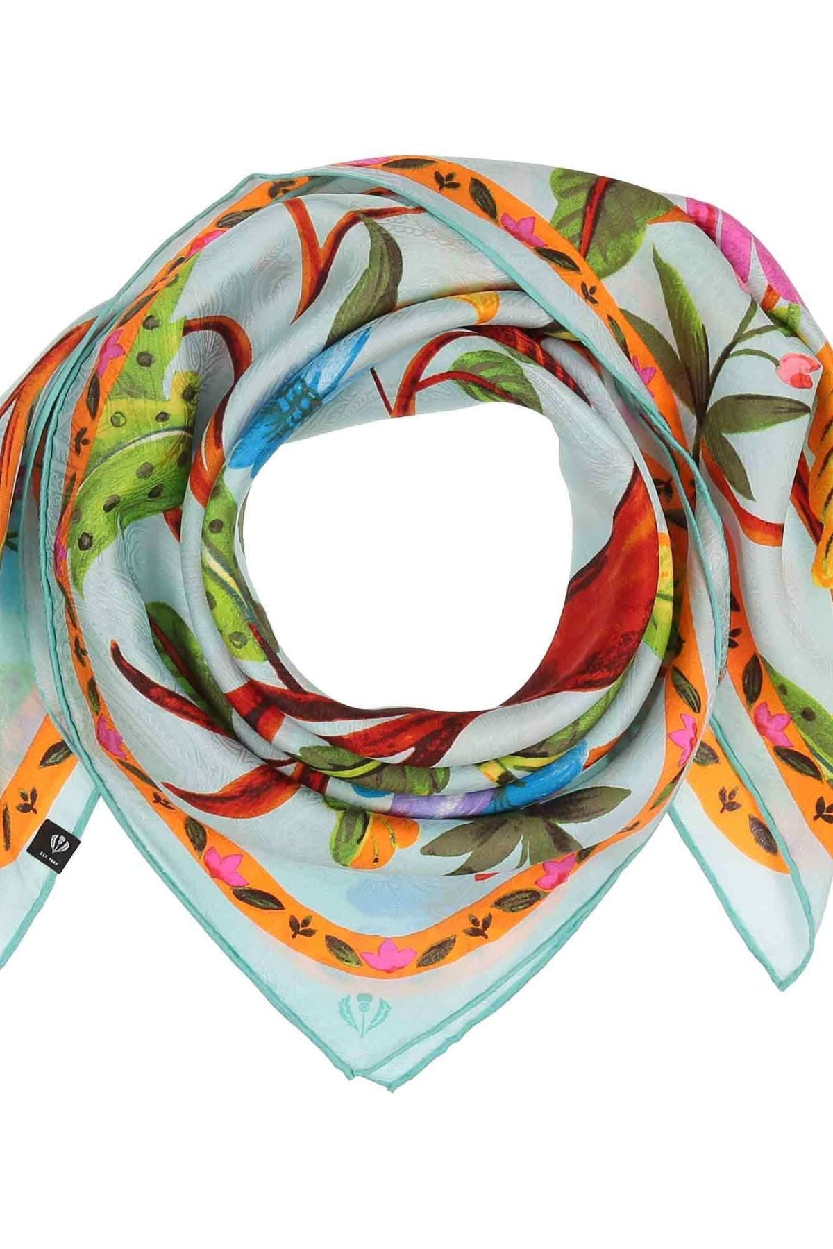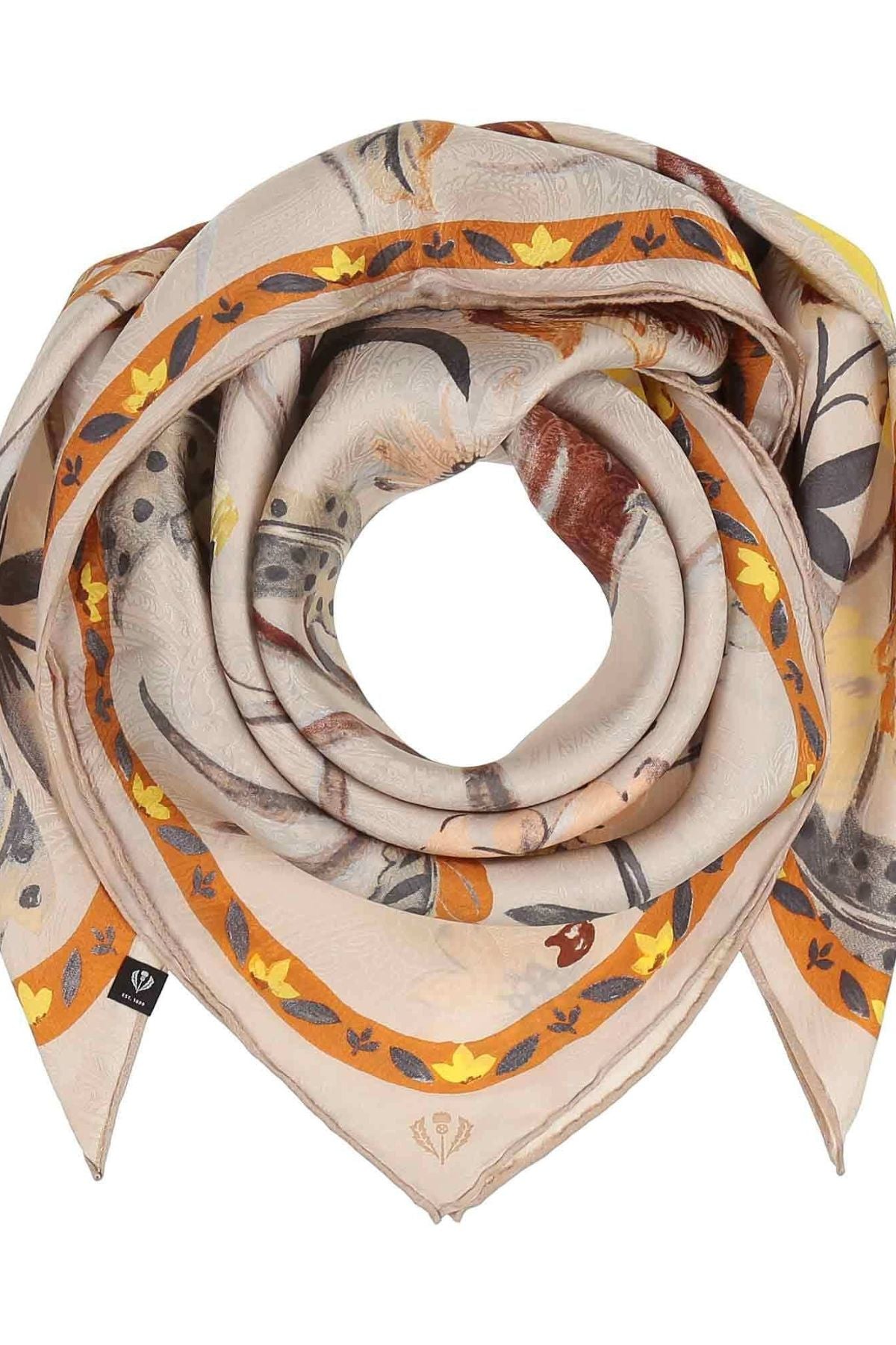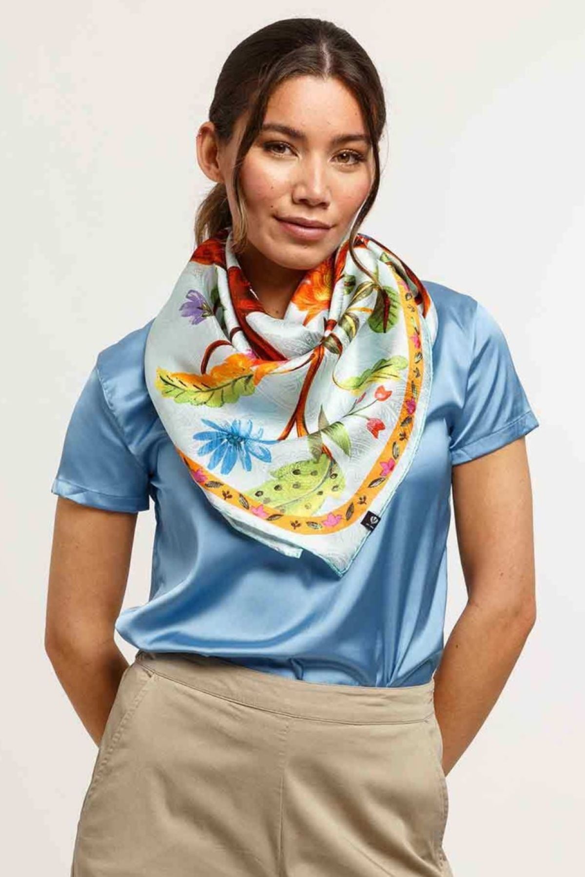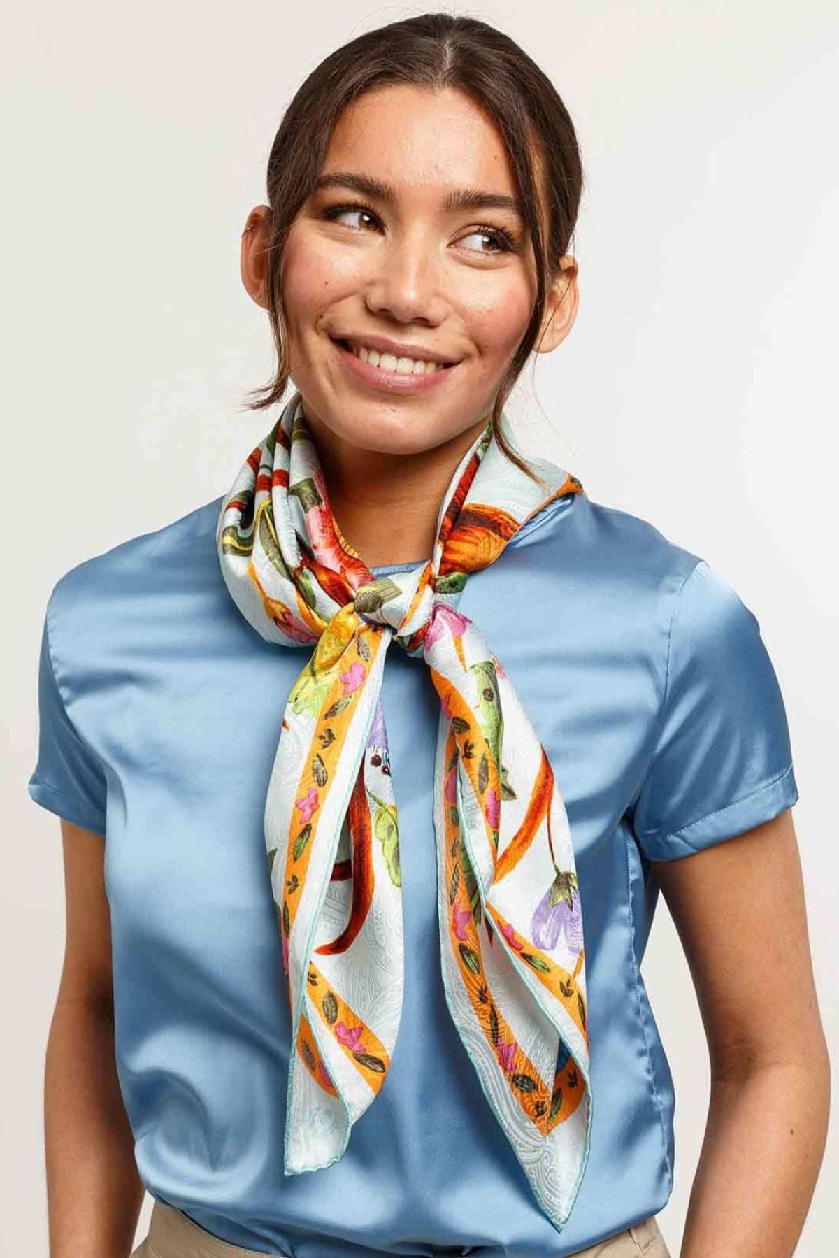 Imagine yourself in this essential eye-catching silk scarf! Our soft silk square printed with this elegant floral inspired design is a real conversation starter. The oversized shape can be worn in a variety of ways - try it in a classic bandana style, knotted like a tie, draped loose over the shoulders, or as a stylish head scarf. The vibrant print and hand-rolled hem make this an elegant and special gift. No need to worry about size here, a perfect gift for every style, every age.