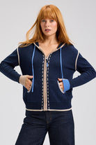 The Zaket & Plover Threaded Hoodie features a zip-front design and a hood trimmed with contrasting colours for a fun pop. Handworked stitch details highlight the seams and zipper, adding a unique touch to this cotton-cashmere blend cardigan. Perfect for layering with a playful twist!