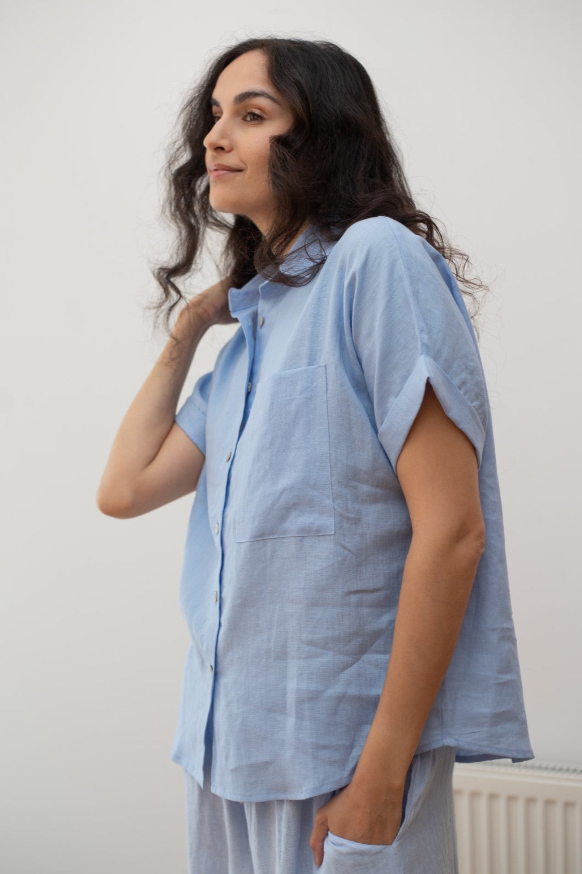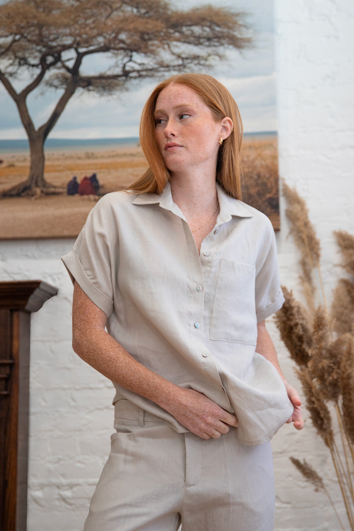 A crisp, structured linen shirt. Short sleeve with a wide cuff, collared, and a breast pocket. Perfect for the office, or a casual dinner out. Pairs beautifully with our Dani Ankle Pant, or your favourite jeans.
