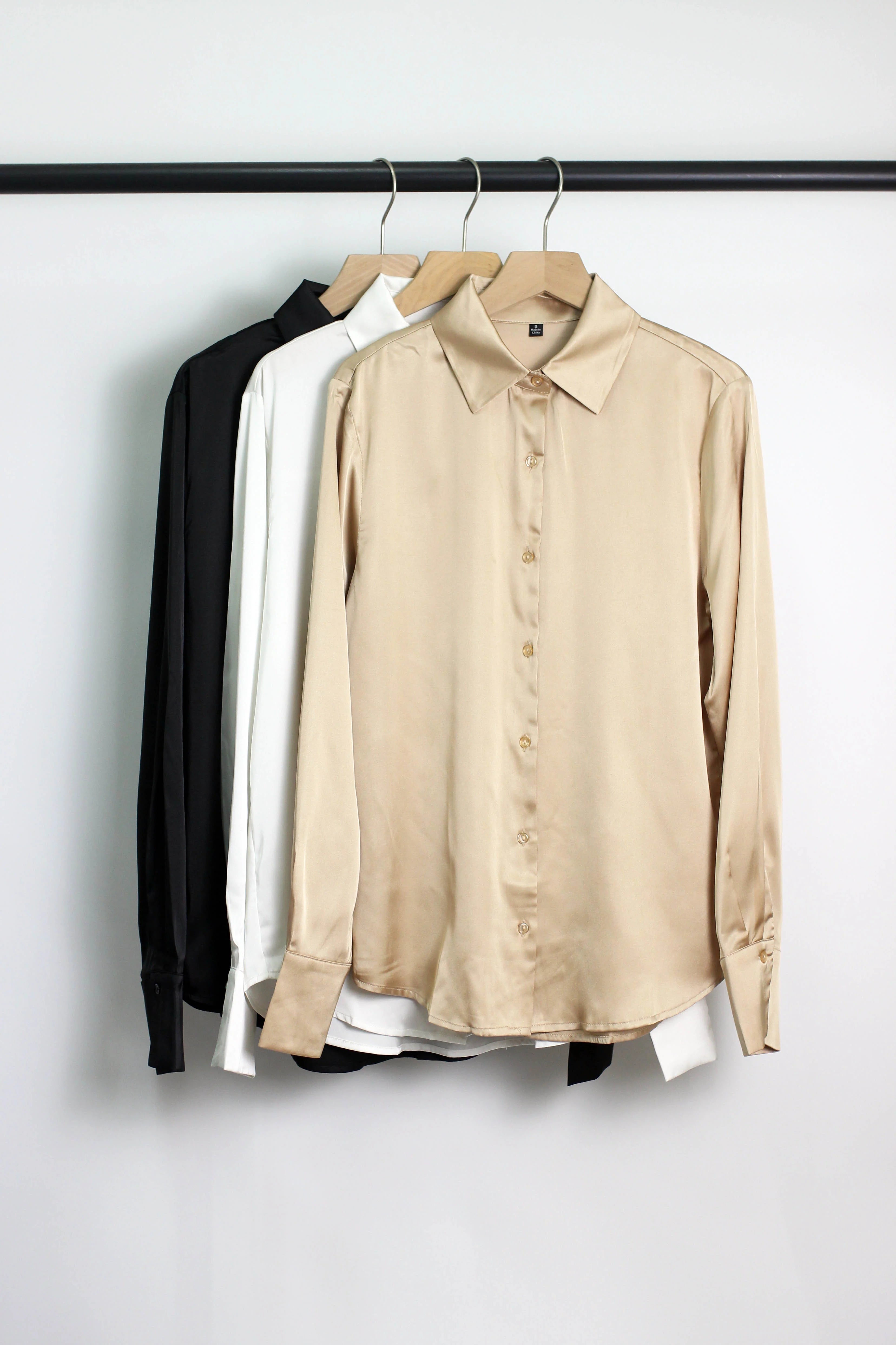 This elegant long-sleeve satin blouse offers a timeless and polished look, perfect for work, formal events, or casual outings. The silky fabric adds a touch of sophistication, while the button-down design ensures versatility. Available in neutral shades of beige, black, and white, this blouse pairs effortlessly with skirts, trousers, or jeans for a variety of chic outfits.