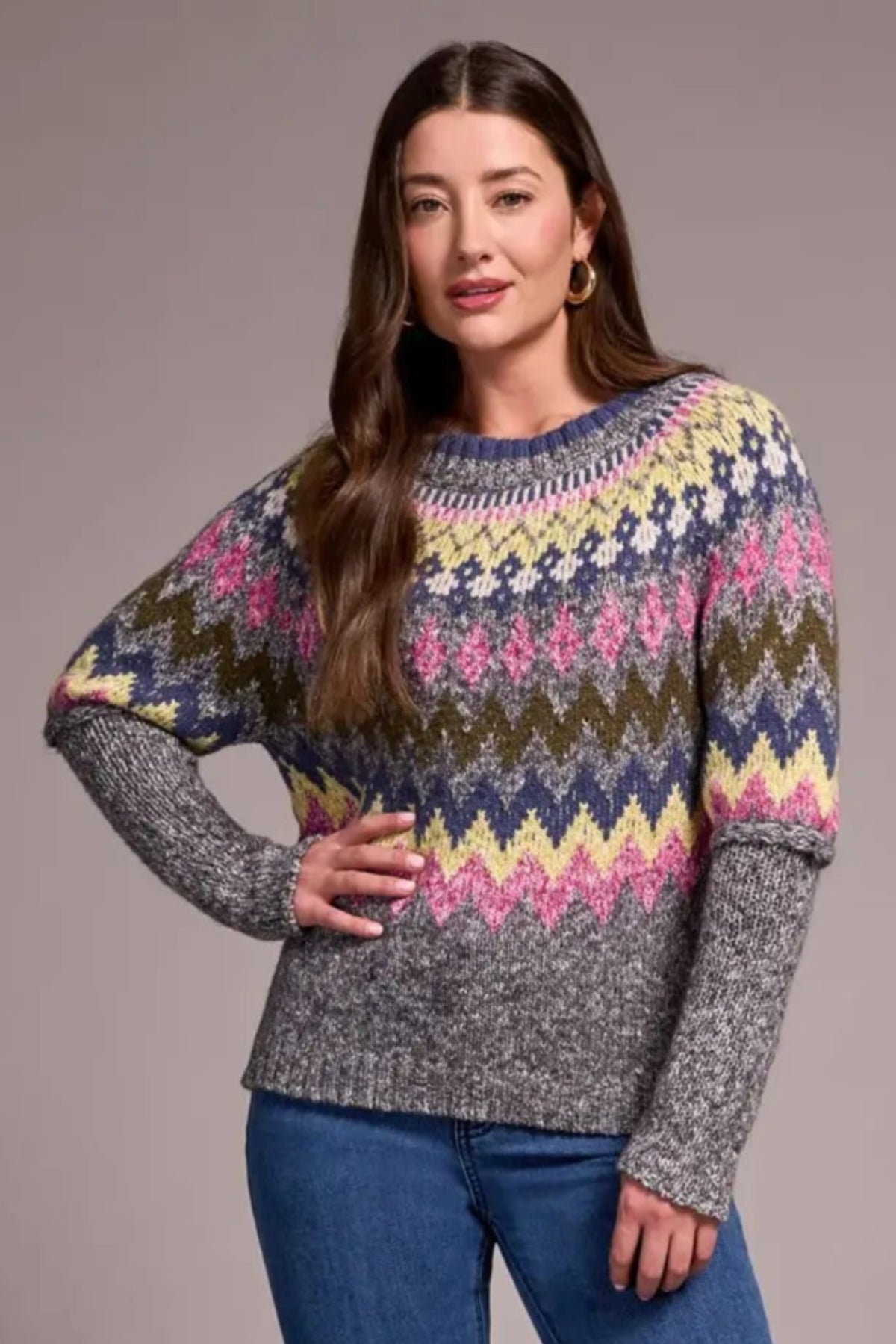 Step into the spotlight with this vibrantly patterned intarsia sweater, guaranteed to turn heads with its captivating multicolor design. Boasting a classic crew neckline, accentuated by raglan shoulder seams, and slightly puffed long sleeves with a ribbed texture from elbow to wrist, it's a statement piece that exudes both style and comfort.