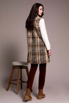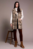 Elevate your layered look with this statement vest, crafted from richly textured fabric in a bold plaid design. Wide-notched lapels introduce a tailored touch, while front pockets offer both style and functionality. A polished piece that brings structure and sophistication to any outfit.