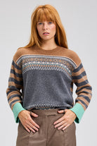 The Zaket & Plover Fairisle Sweater combines a classic Fair Isle pattern with a modern twist, featuring vibrant striped sleeves and back with colourfully contrasted cuffs. Crafted from a soft cotton-wool blend, this crew neck sweater offers both warmth and breathability, making it an expert choice for stylish comfort in cooler weather. Its unique design adds a playful yet refined touch to any wardrobe.