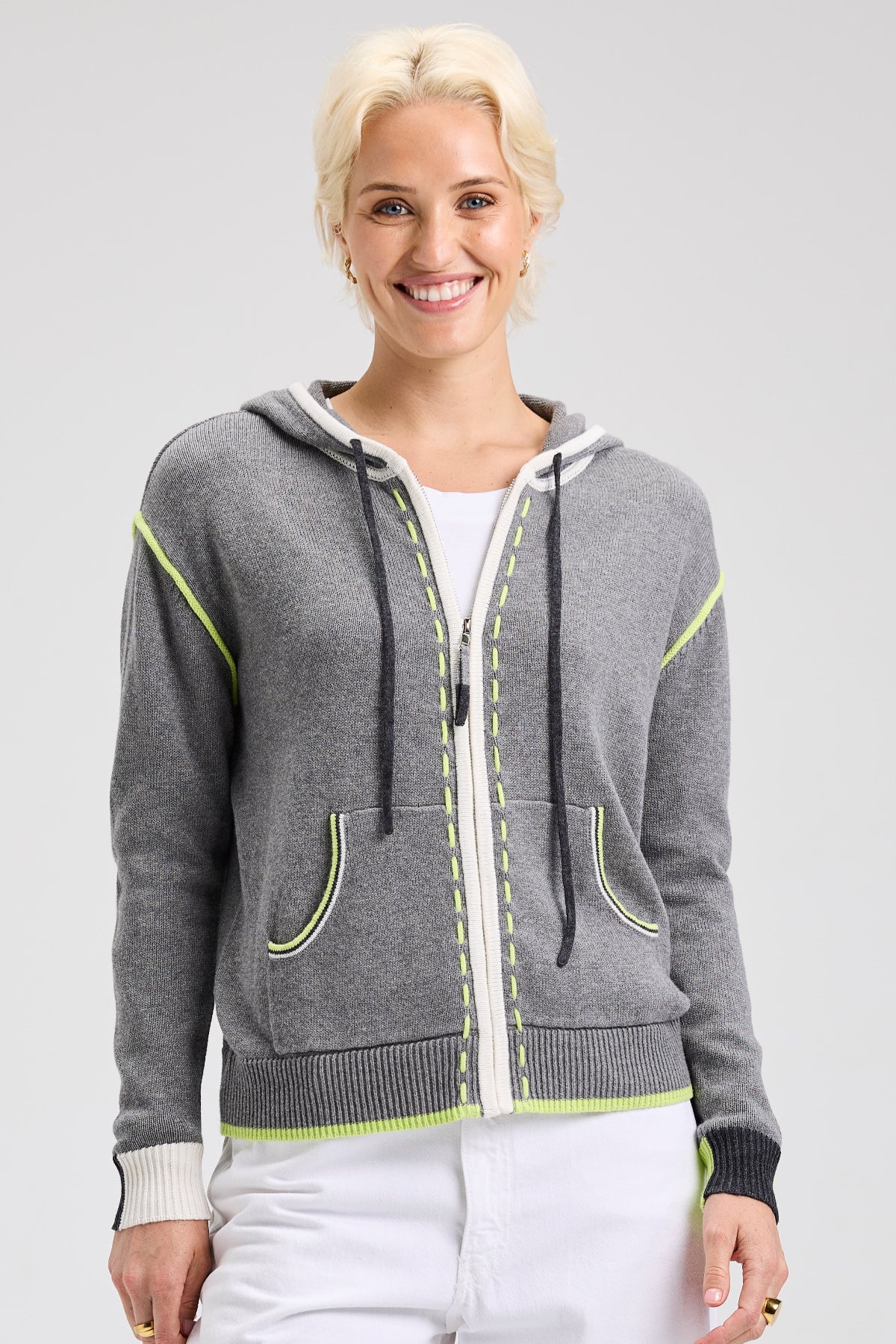 The Zaket & Plover Threaded Hoodie features a zip-front design and a hood trimmed with contrasting colours for a fun pop. Handworked stitch details highlight the seams and zipper, adding a unique touch to this cotton-cashmere blend cardigan. Perfect for layering with a playful twist!