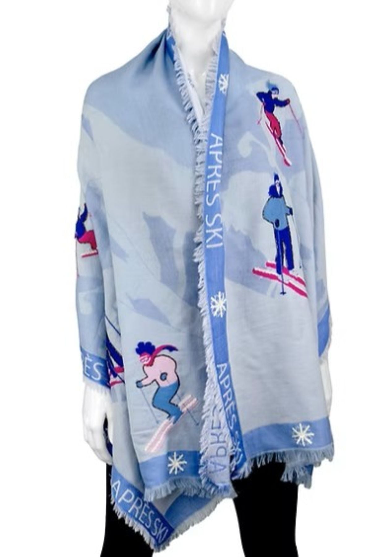 A fun ski inspired scarf featuring mountains and skiers, and sequin embellished snowflakes.