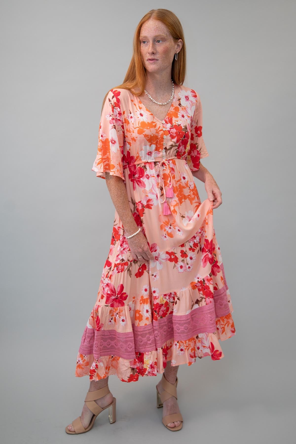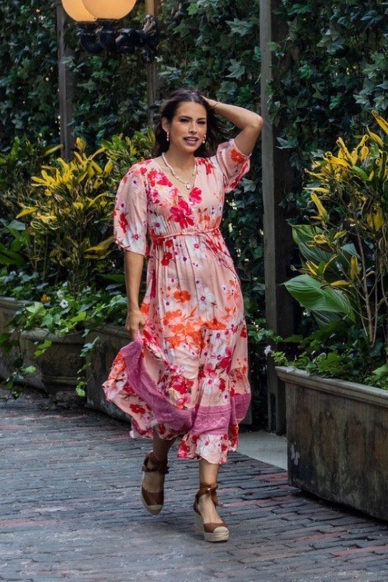 Look stunning in our Camille Dress! This 100% viscose dress boasts a v-neckline and tiered details with lace detailing towards the bottom. Feel beautiful and confident all day long in this timeless summer piece.
