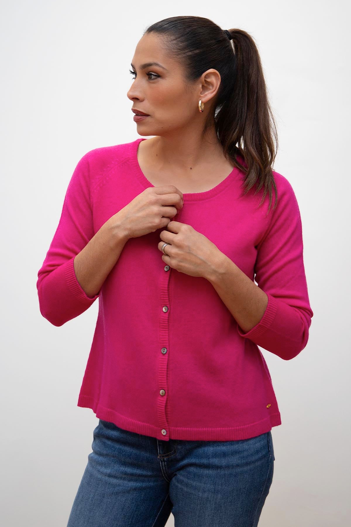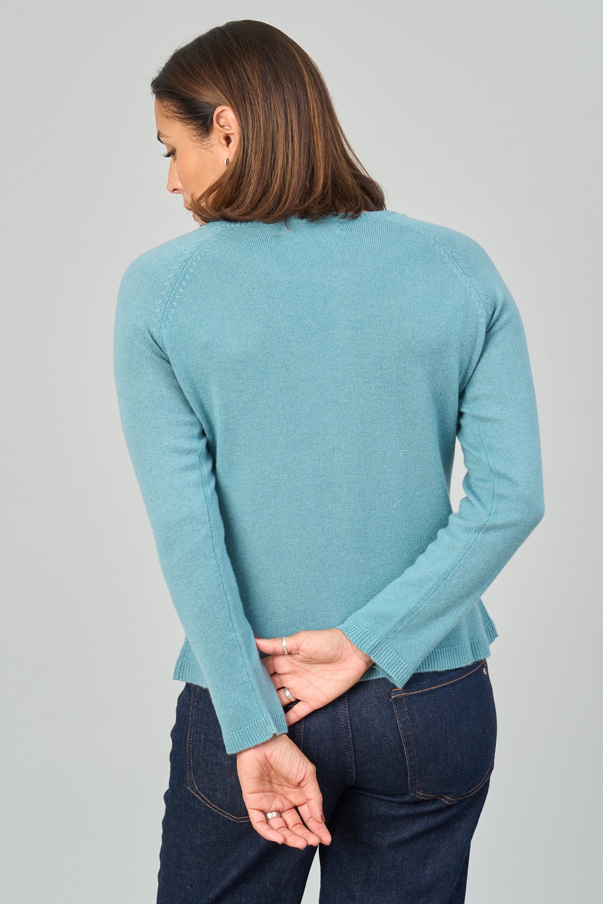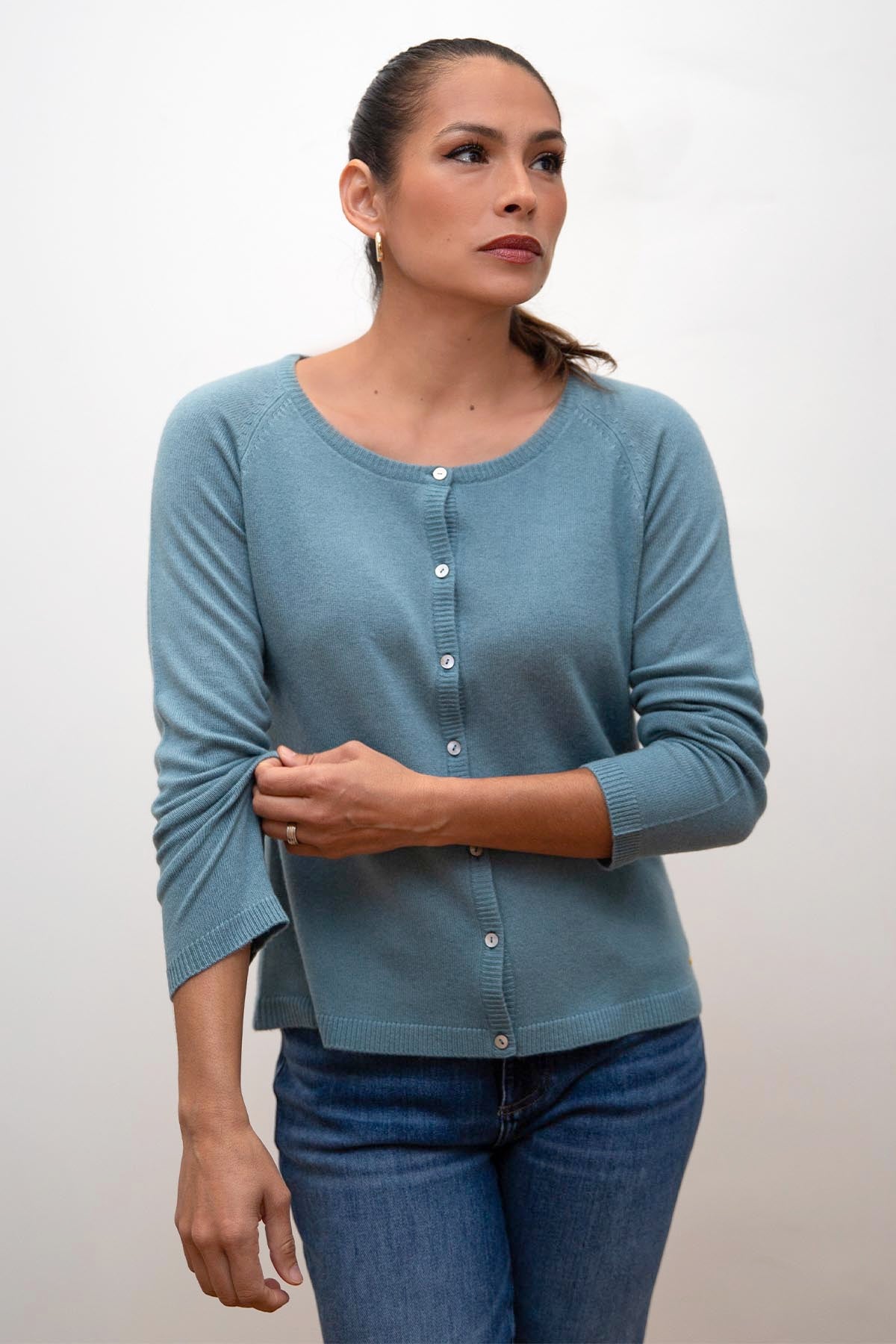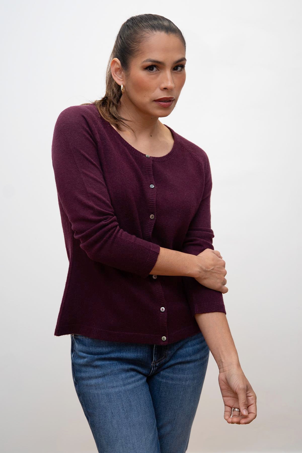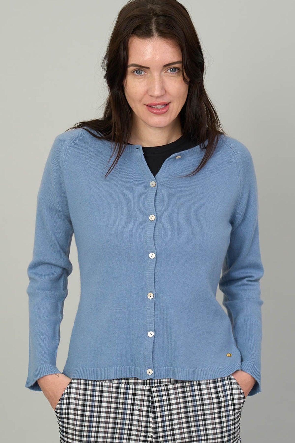 From our Cashmere Collection. This crew neck cashmere cardigan is a wardrobe classic. Similar to our Millie Cardigan, but with a looser fit and a more modest crew neckline. Delicate buttons down the front provide a feminine touch.