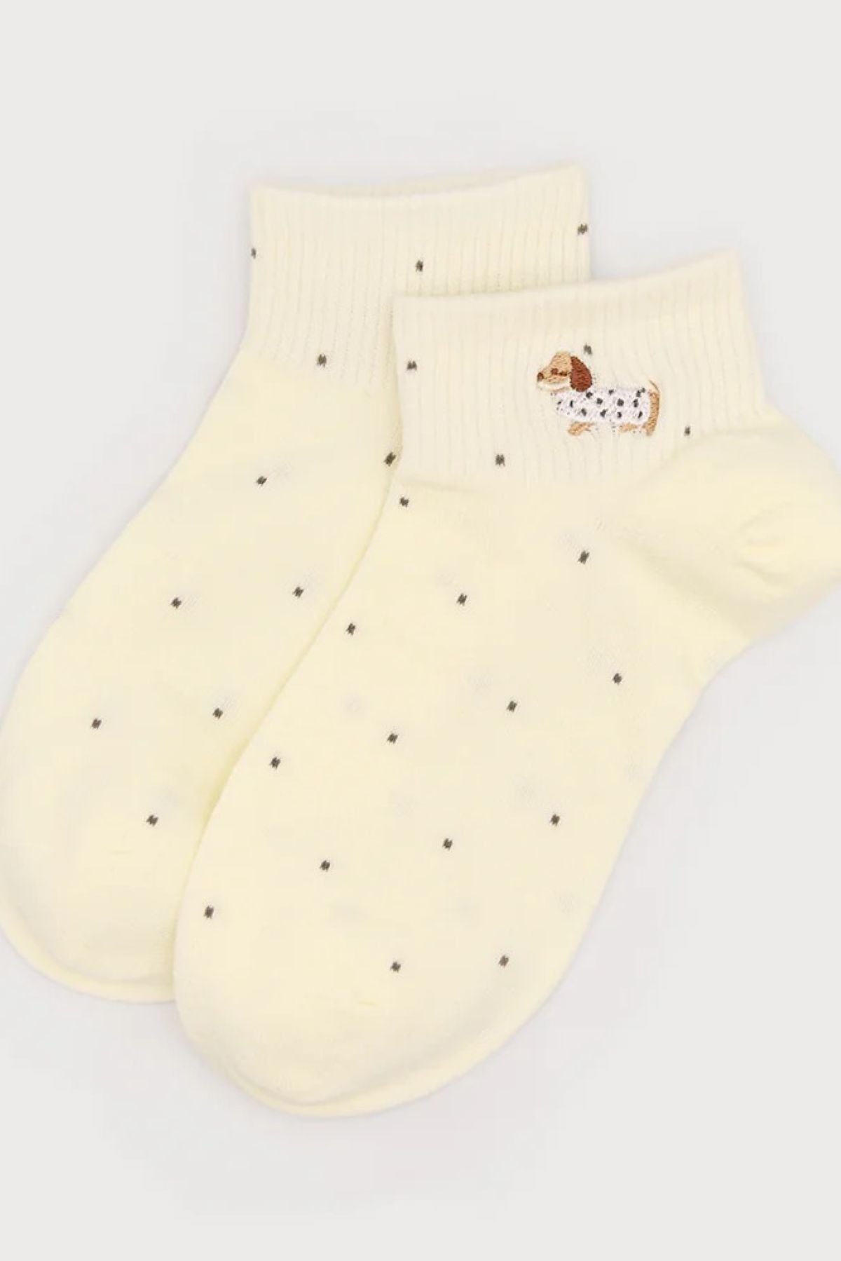 Add playful charm to your everyday style with these delightful short socks featuring a classic polka dot print and adorable dog embroidery. These comfortable socks combine whimsical design with quality construction, perfect for dog lovers and anyone who appreciates fun.