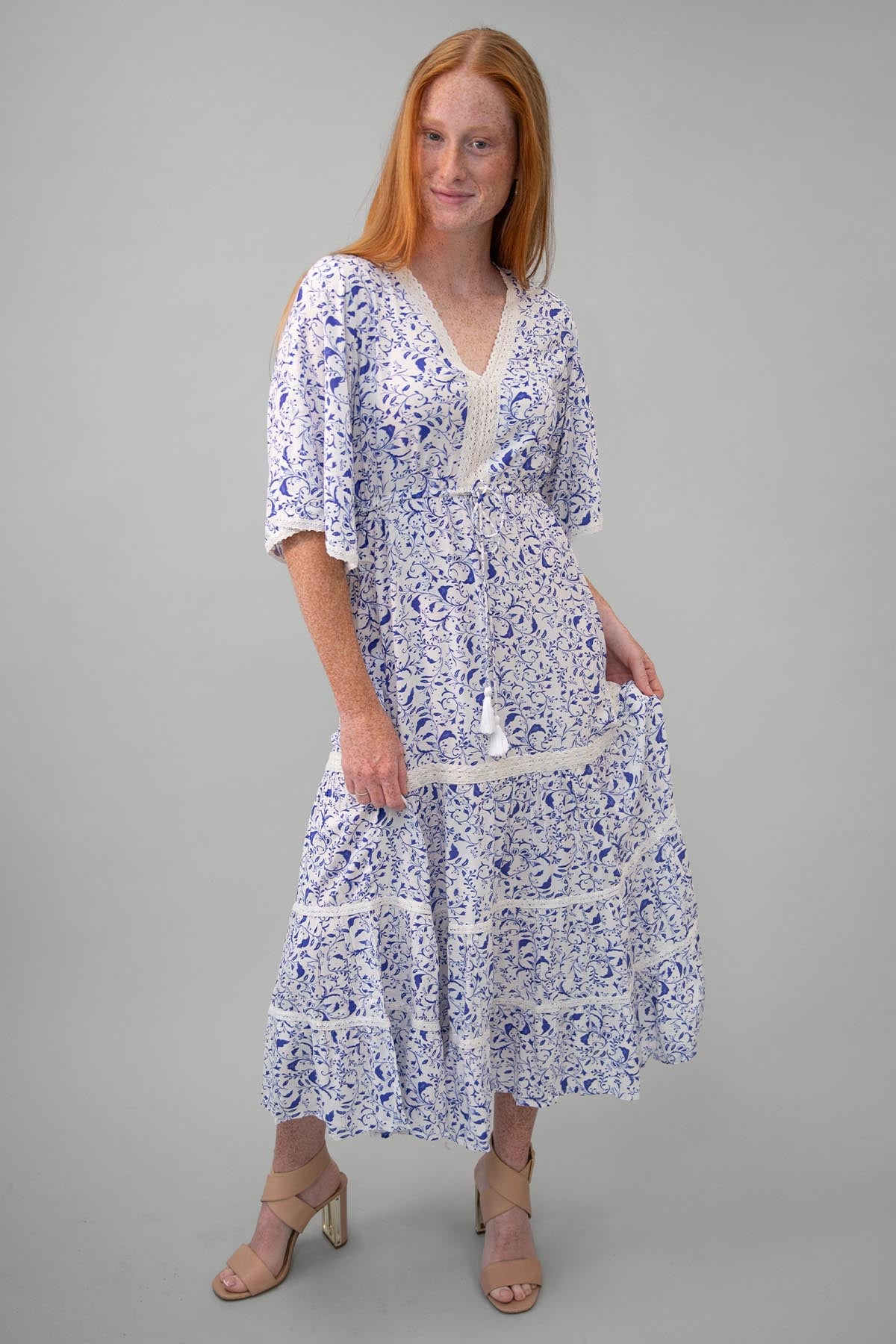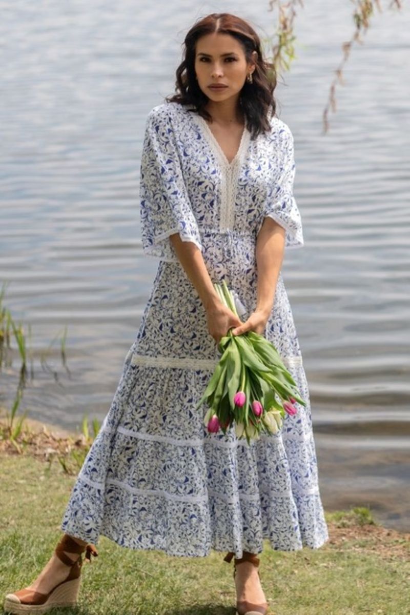 Look stunning in our Sylvie Dress! This feminine dress boasts a v-neckline and tiered details with lace trim for a romantic, French-inspired look. Feel beautiful all day long in this timeless piece.