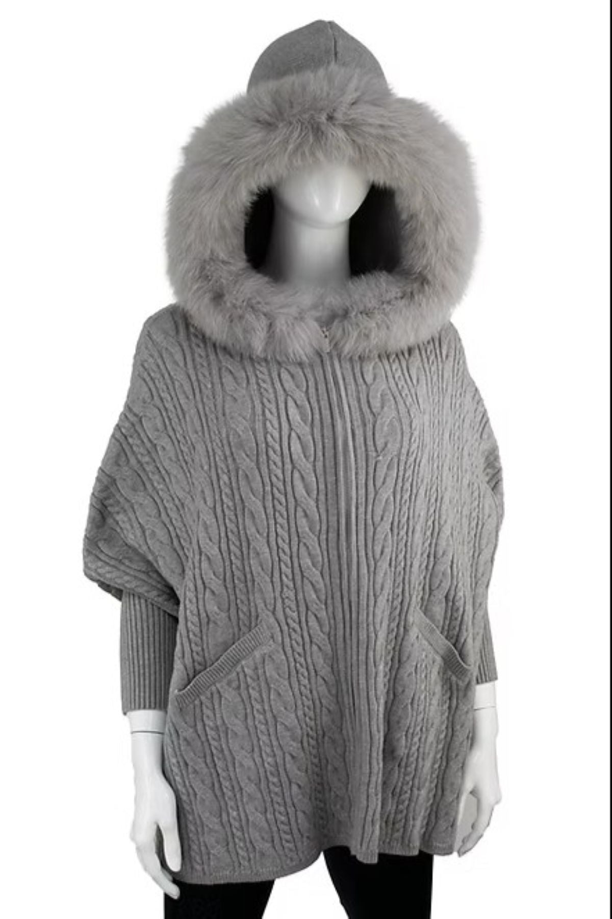 Luxurious cable knit poncho with hood trimmed in real fox fur. Features a zipper closure in the front, front diagonal pockets, and a slightly shorter sleeve that is more fitted on the forearm.
